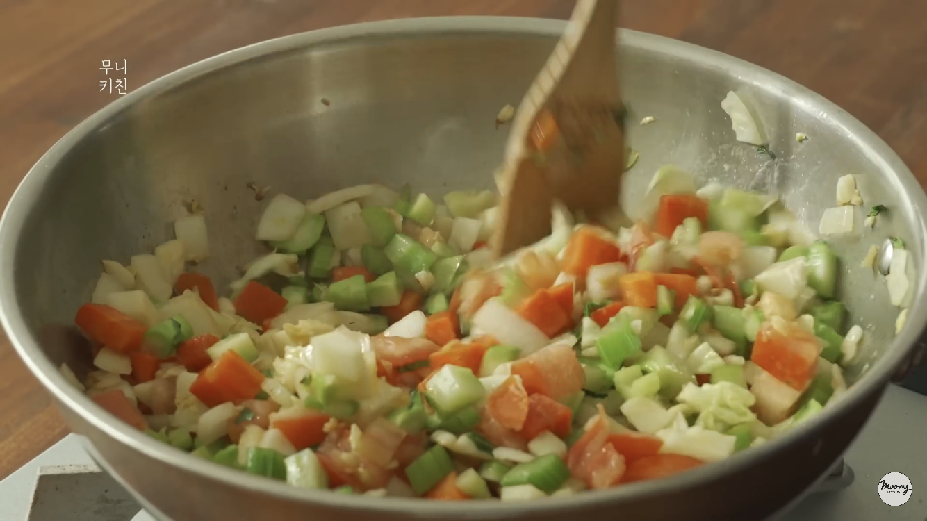 다양한 종류의 야채를 썰고 볶아주고 토마토 퓨레를 이용해 끓여주듯 볶아준뒤 마지막 병아리콩을 같이 넣고 익혀주고 파마산 치즈가루를 뿌리며 멋진 그릇에 한끼!