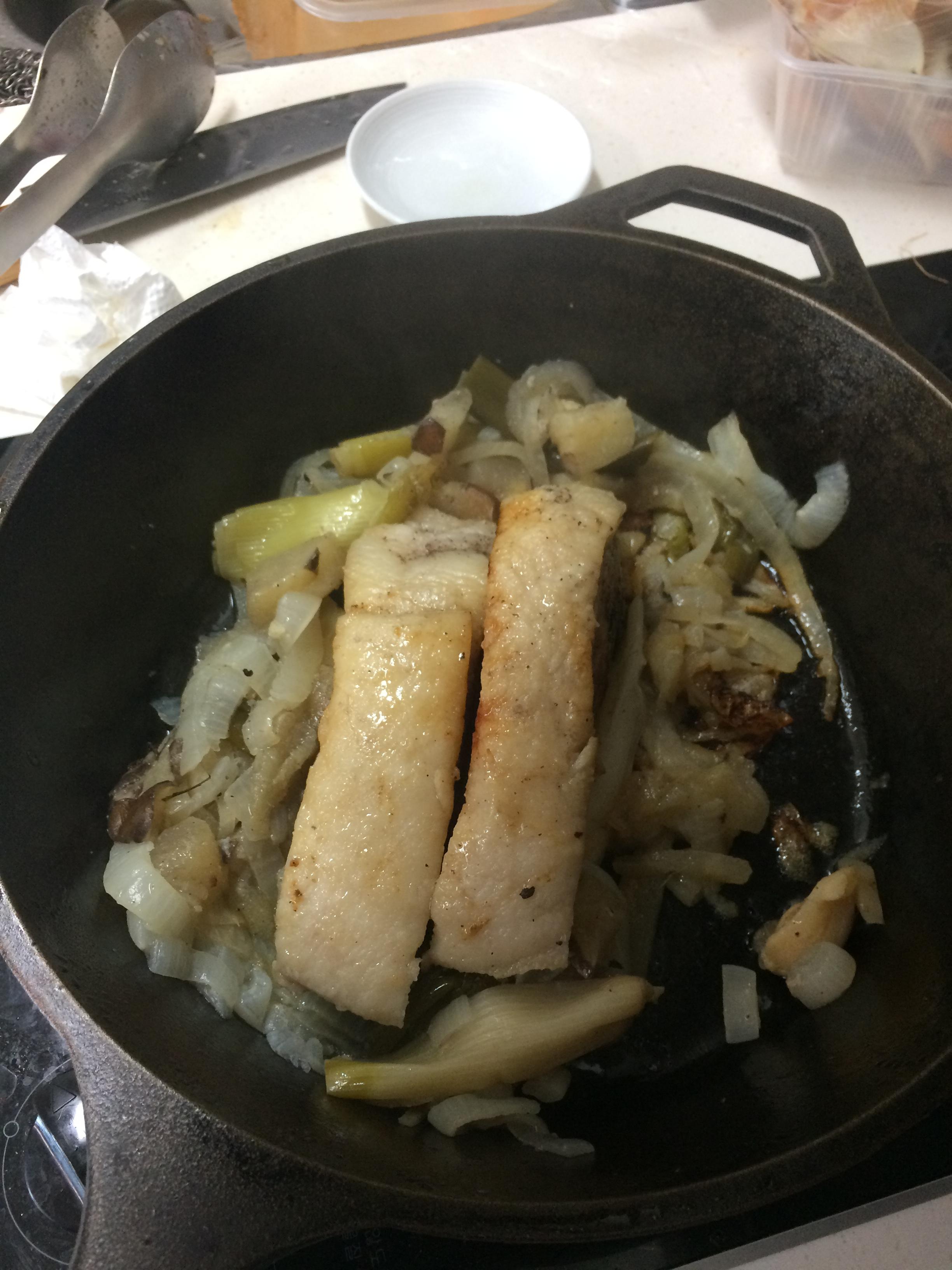 총 40분정도 익힌 고기를 달구어진 후라이팬에 익혀진(양파, 파, 마늘 등) 과 함께 한번더 겉을 구워 준다.