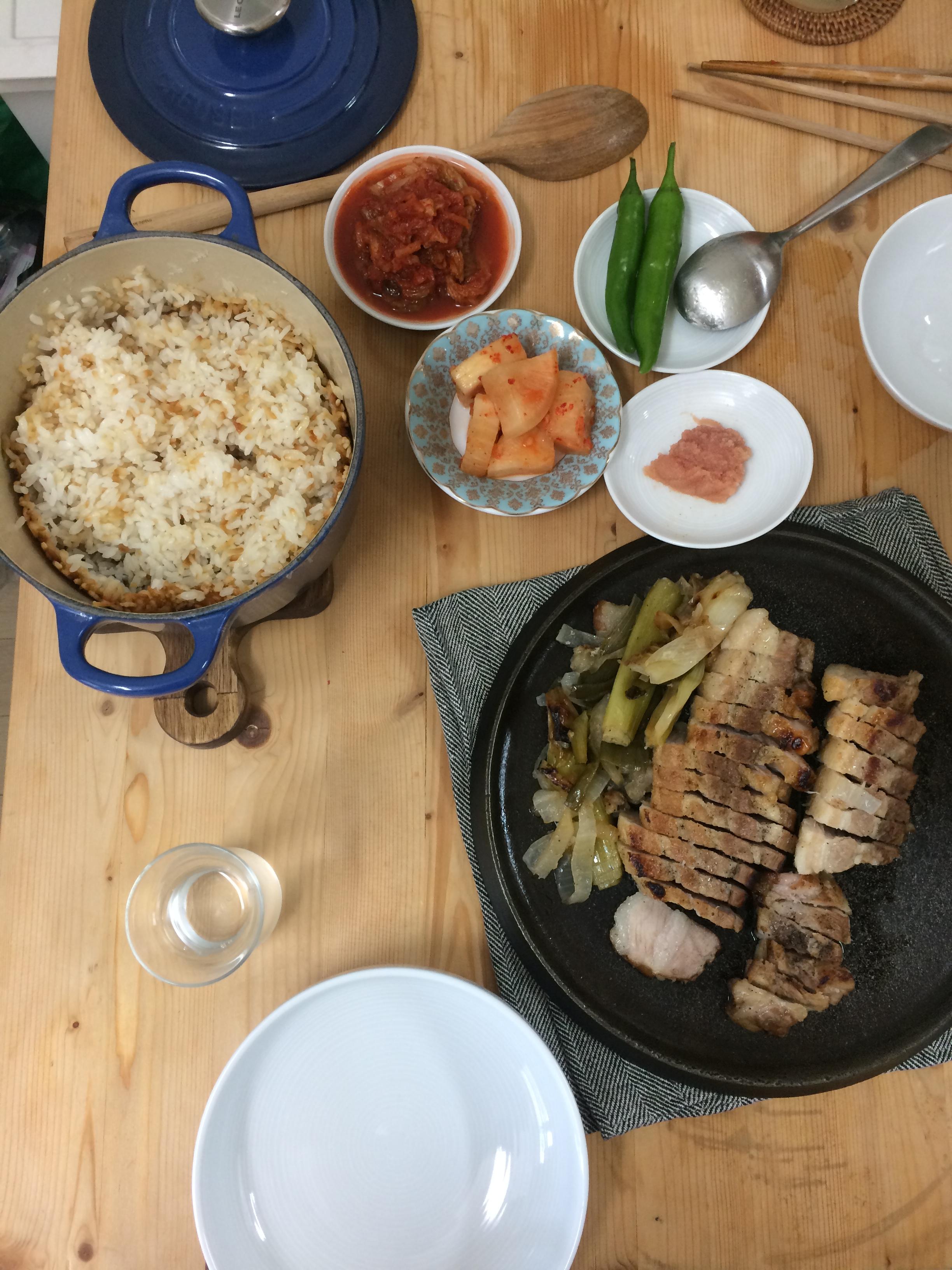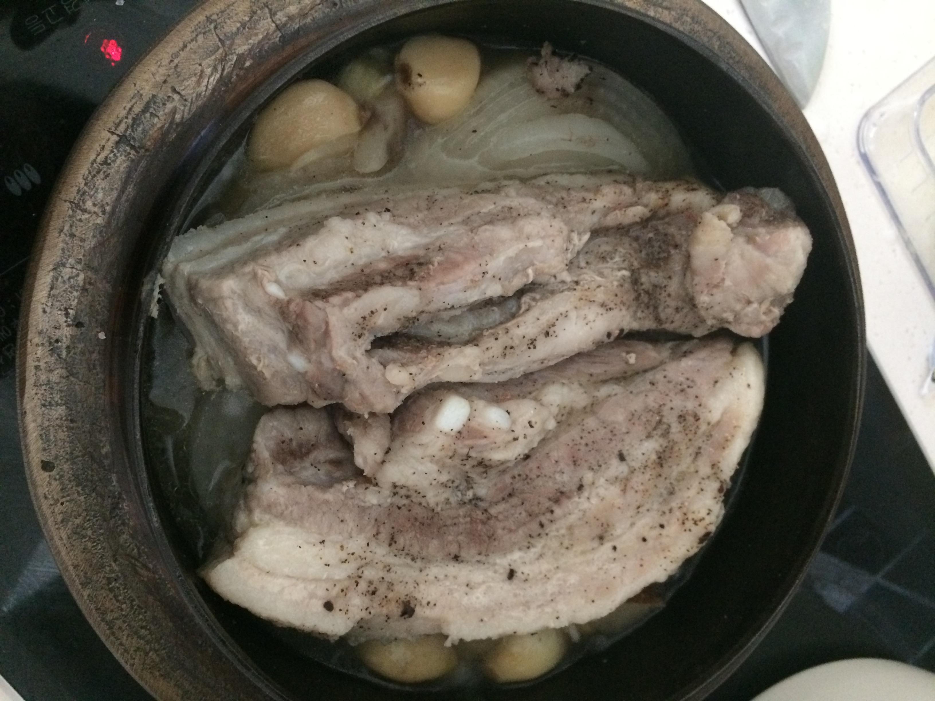 시즈닝된 돼지고기를 얹고, 약불에 익힌다.(15분) 필요에 따라 더 해도됨.