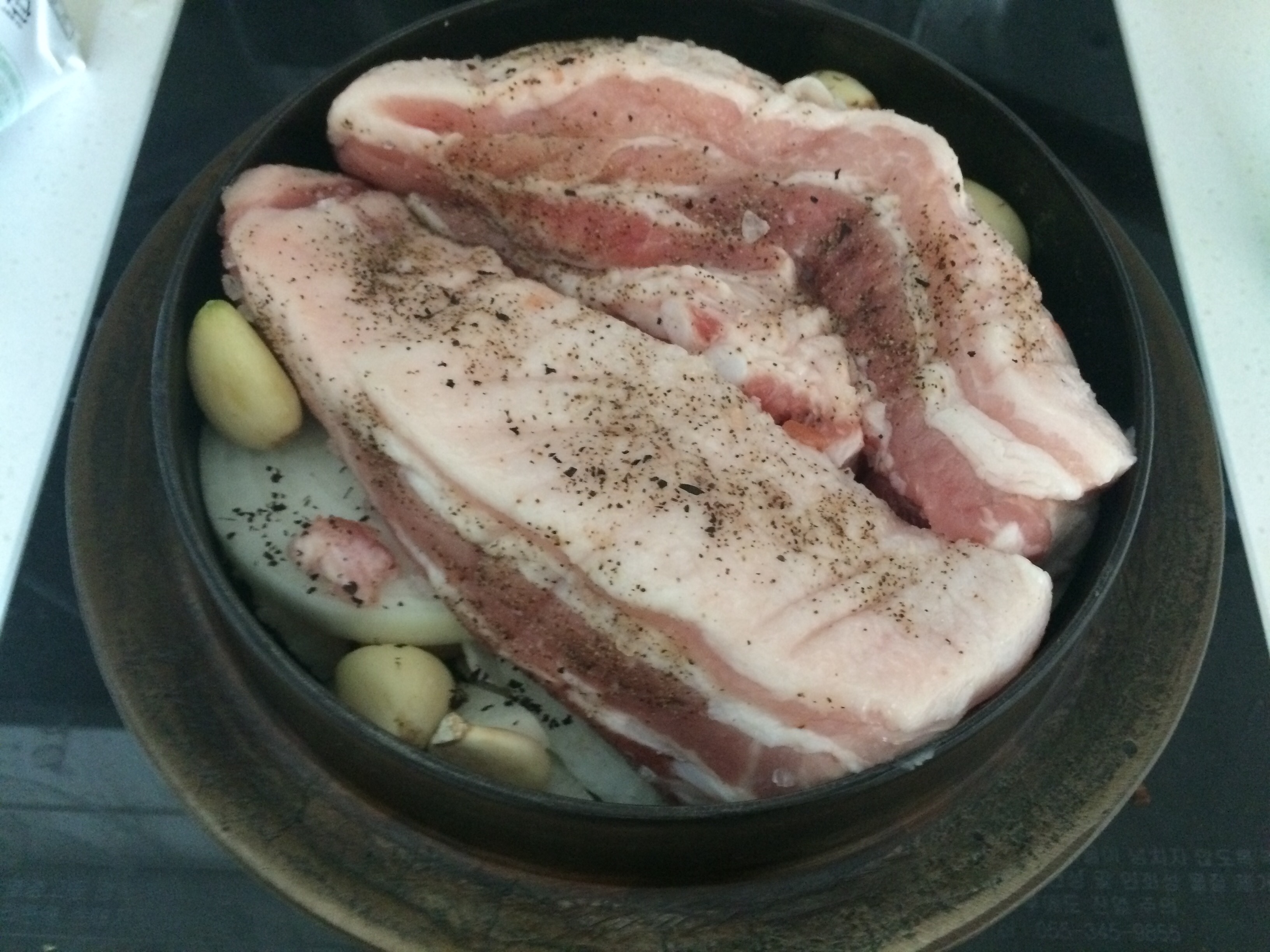 돼지 삼겹살을 후추랑 소금에 시즈닝.(약 5분) 굳이 긴 시간은 필요없는듯.
