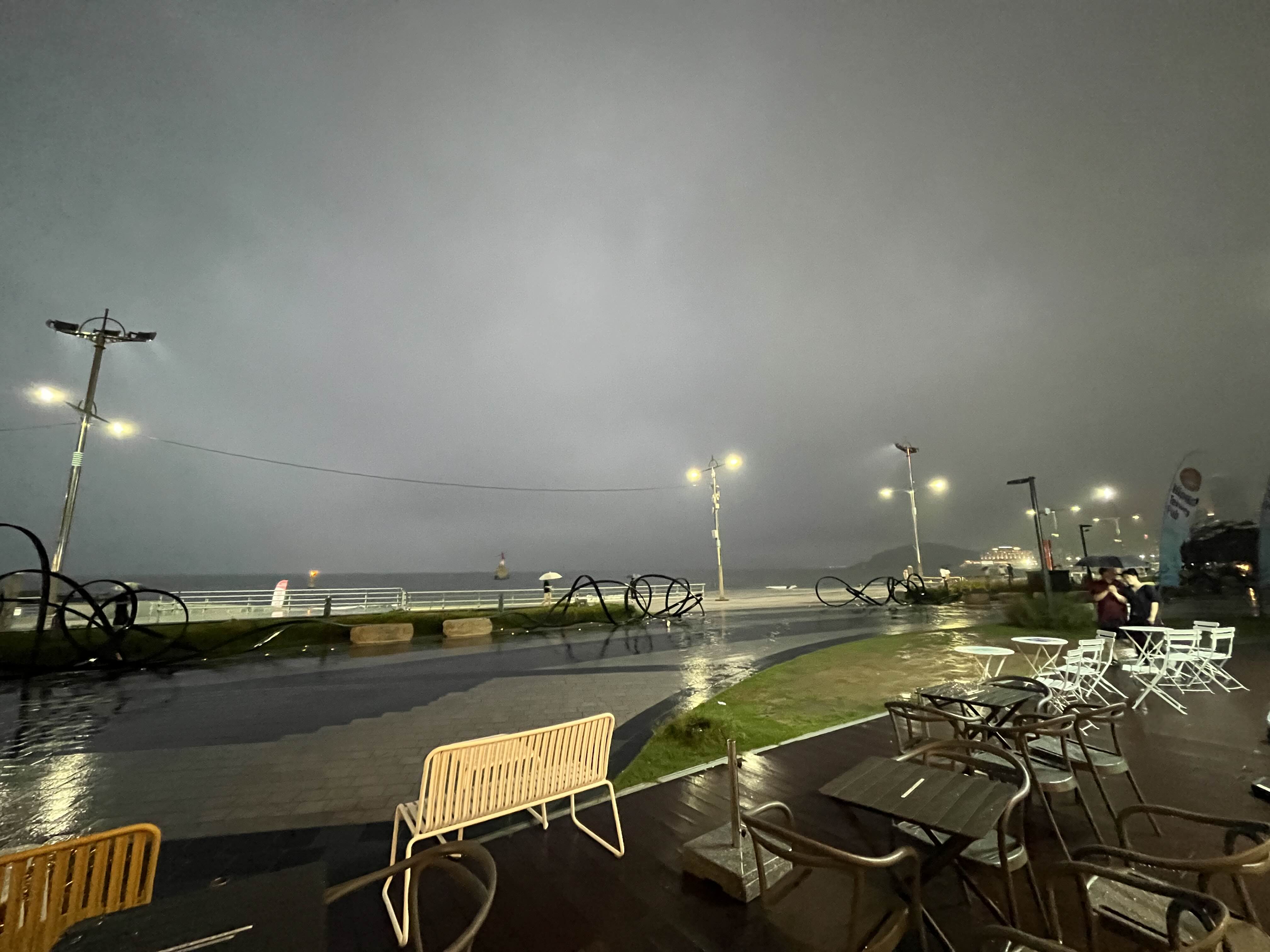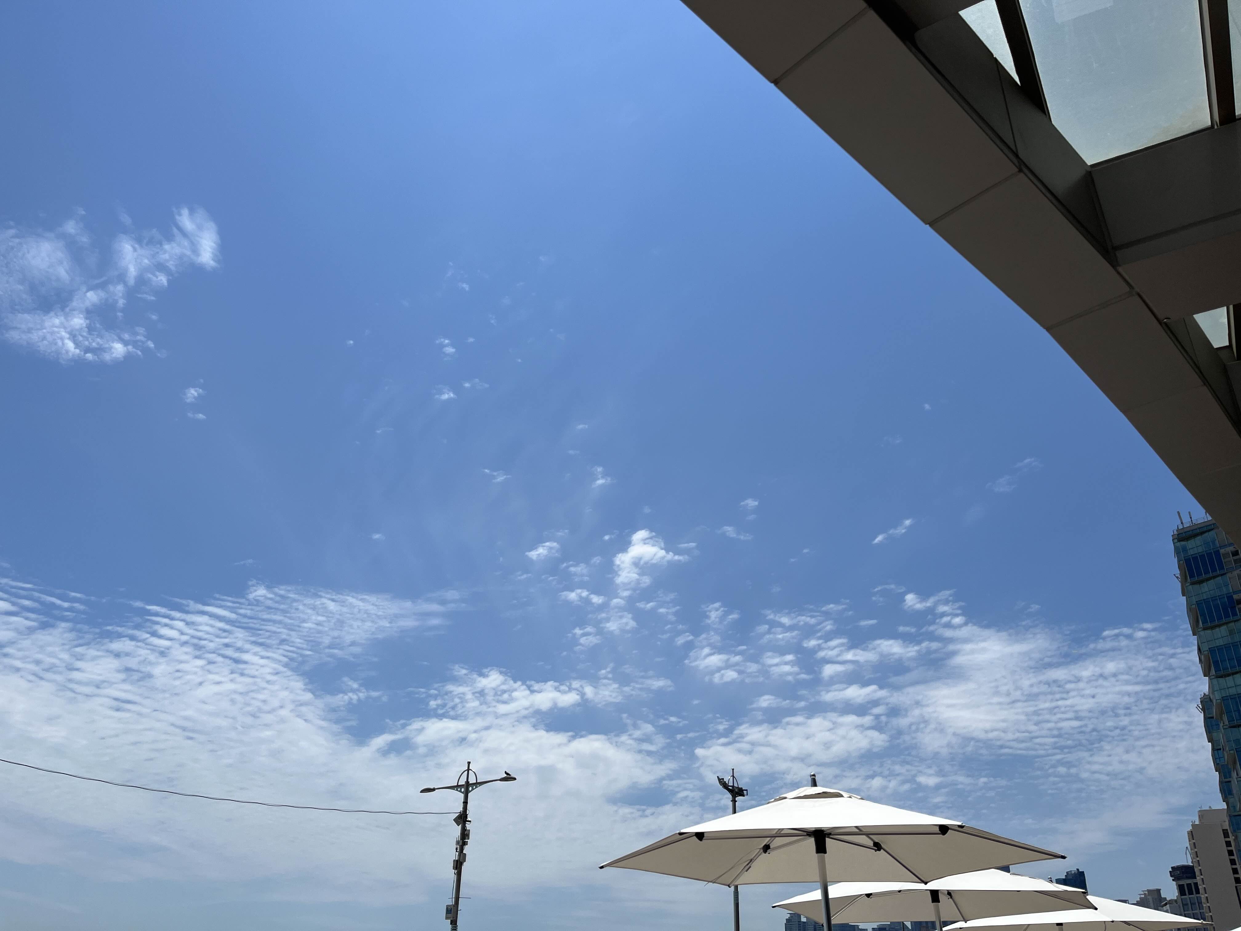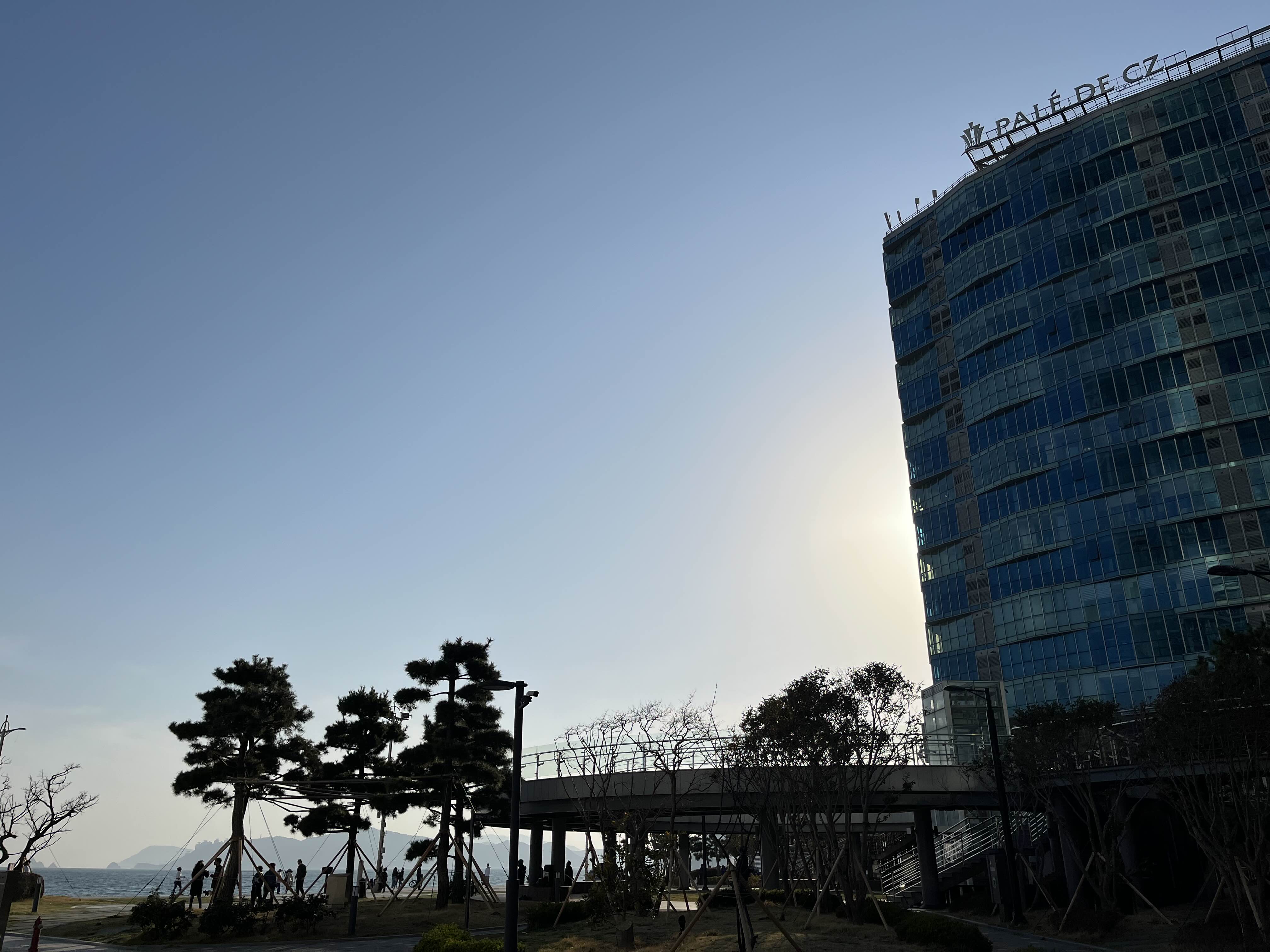 날씨가 무척이나 좋다. 엘시티와 팔레드시즈 사이에 위치한 테라스에는 사람들이 많이 있고, 2층에는 경치도 좋다(그물망 벤치도 있다)