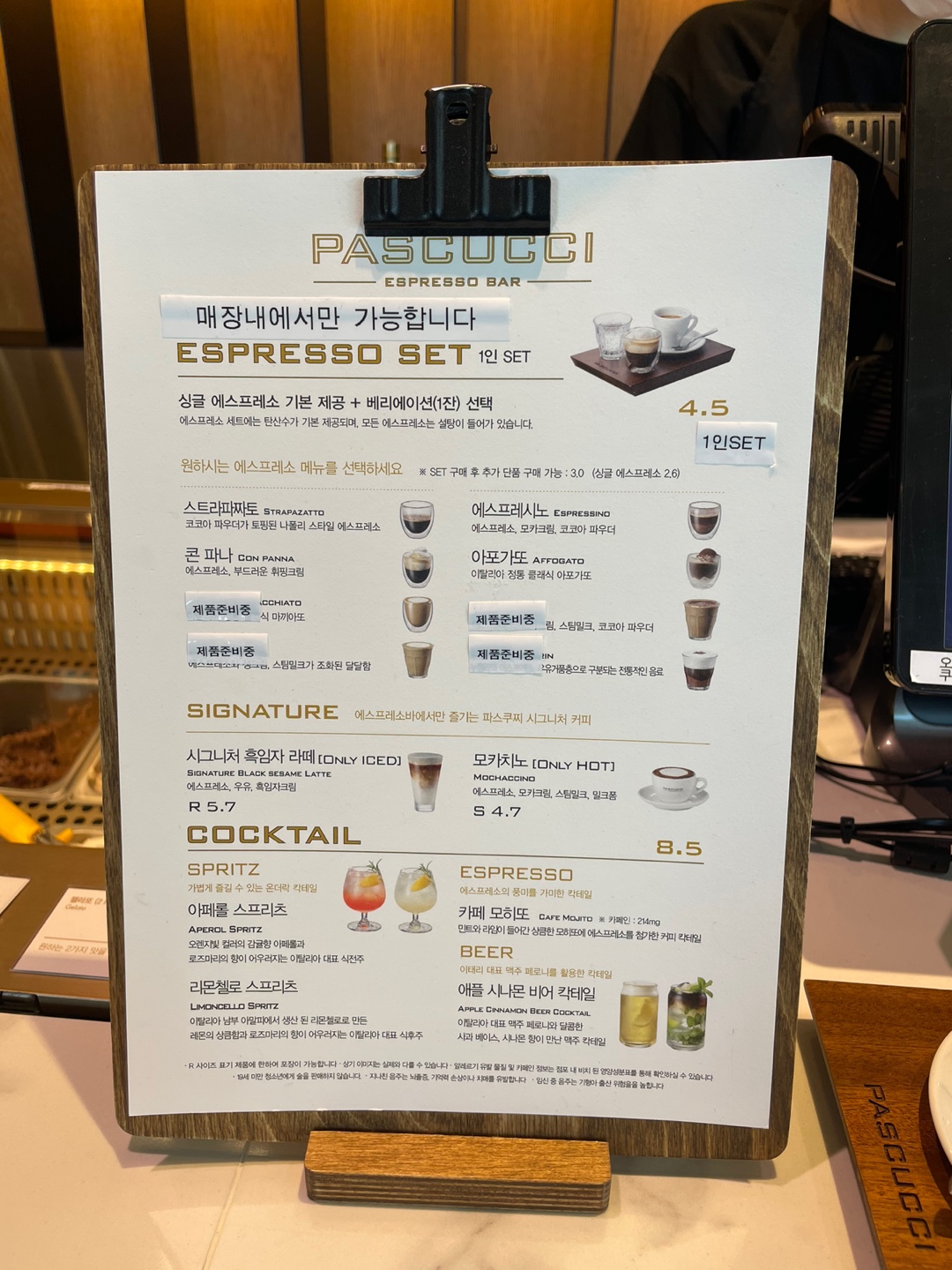 에스프레소 세트가 특이했다. 그리고 와인도 판매되었다. 웃긴건 외국인 관광객들이 테라스에서 매장옆 GS25에서도 와인을 사먹는 모습이 종종 보였다. 키오스크로 주문가능하고, 직원분에게 바로 주문도 가능하다.!