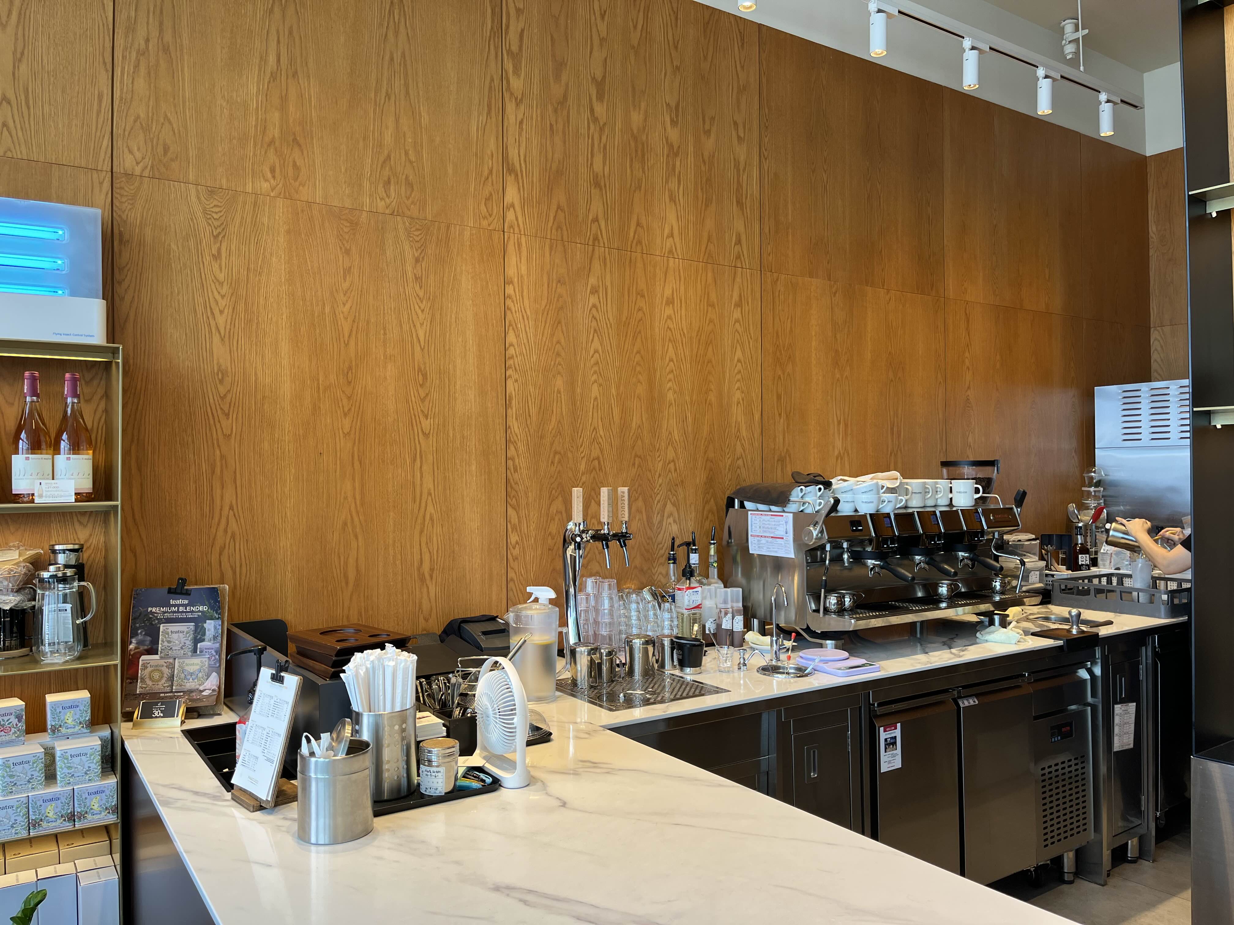 창가를 보는 태이블에는 무선 충전기가 설치되어있고, 높은 층고로 시원한 개방감이 느껴진다. 매장자체의