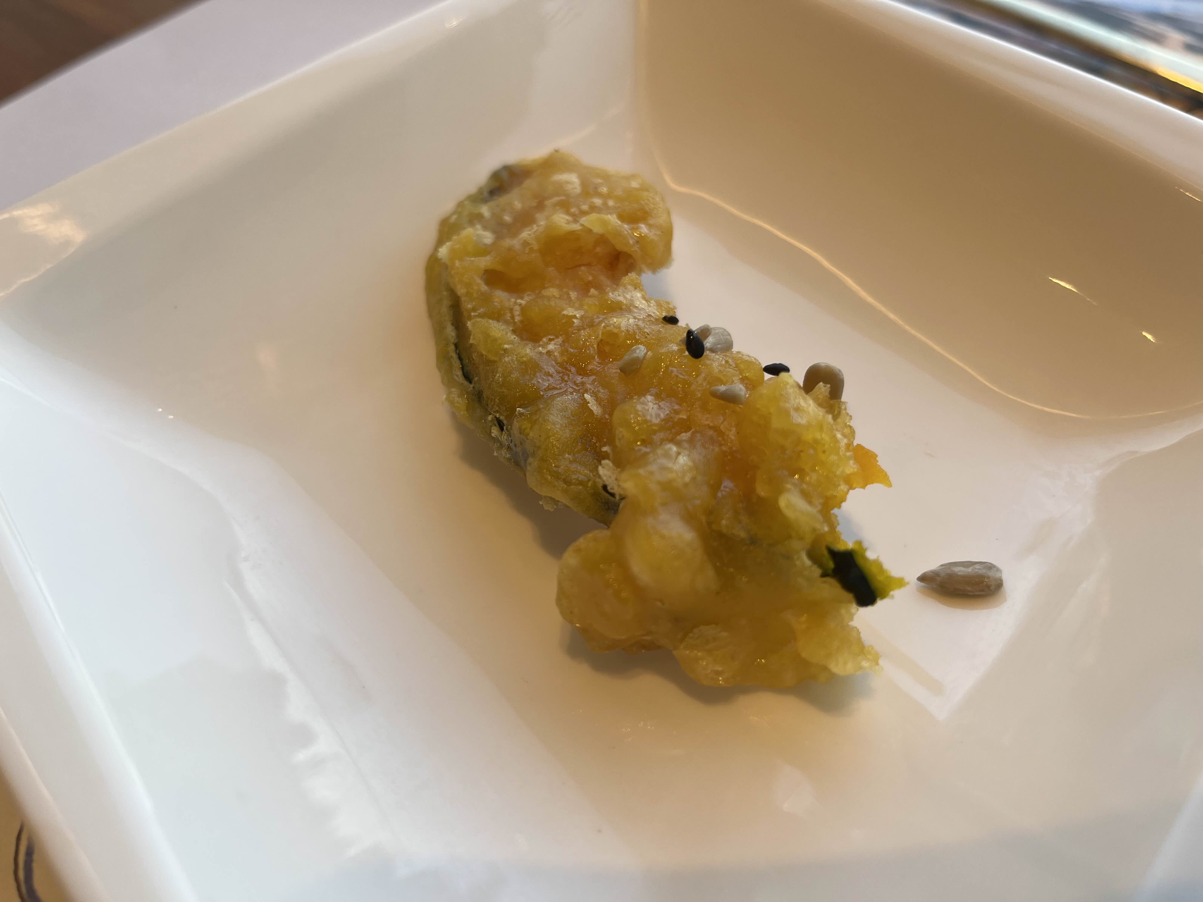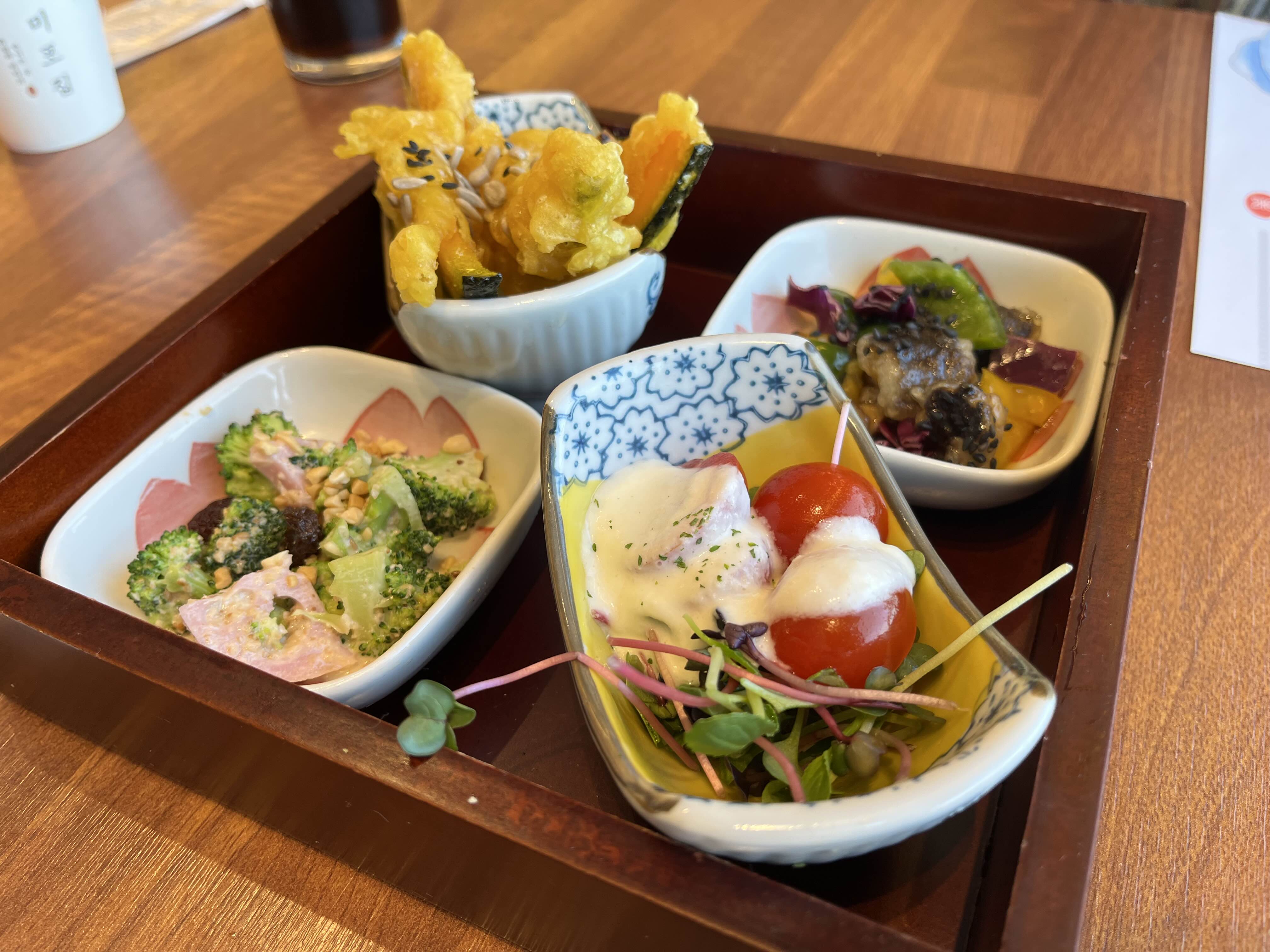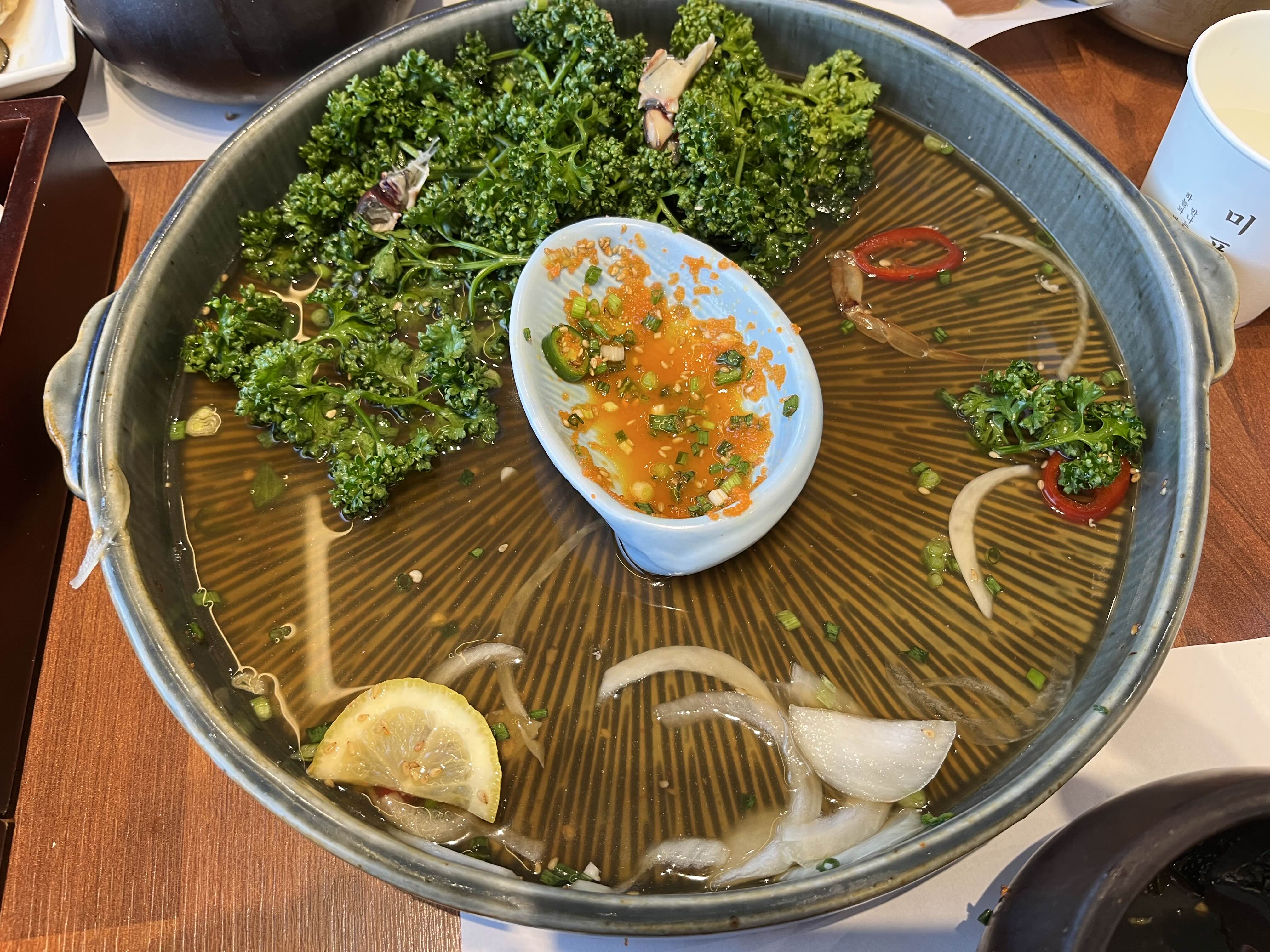 에피타이저가 나오고, 해물장, 그리고 솥밥이 함께 나온다. 에피타이저는 호박튀김, 버섯, 토마토와 새싹, 브로콜리와 연근무침으로 한상이 나오고,