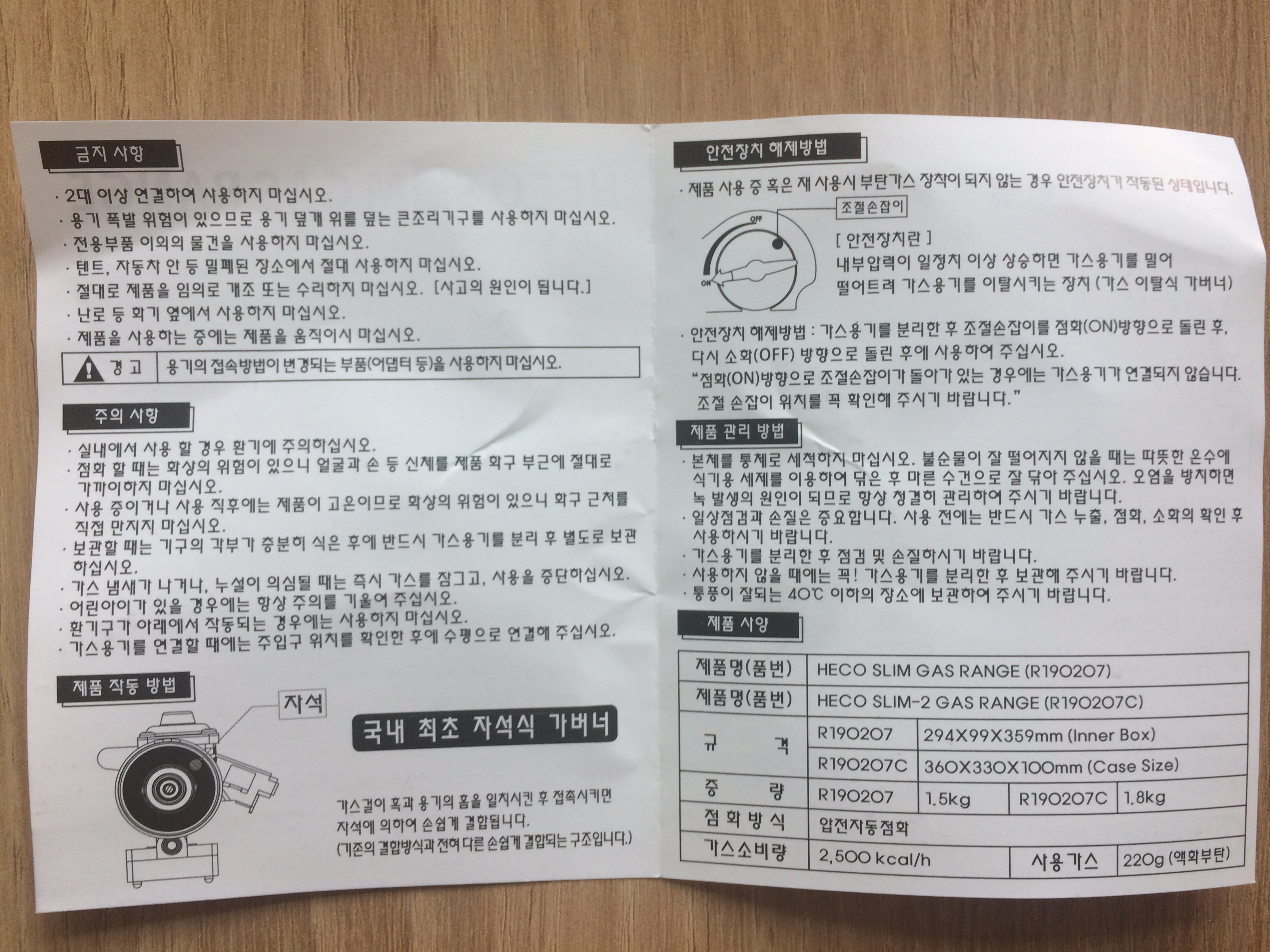 - 가스 소비량 : 2,500 kcal/h (210g/h)