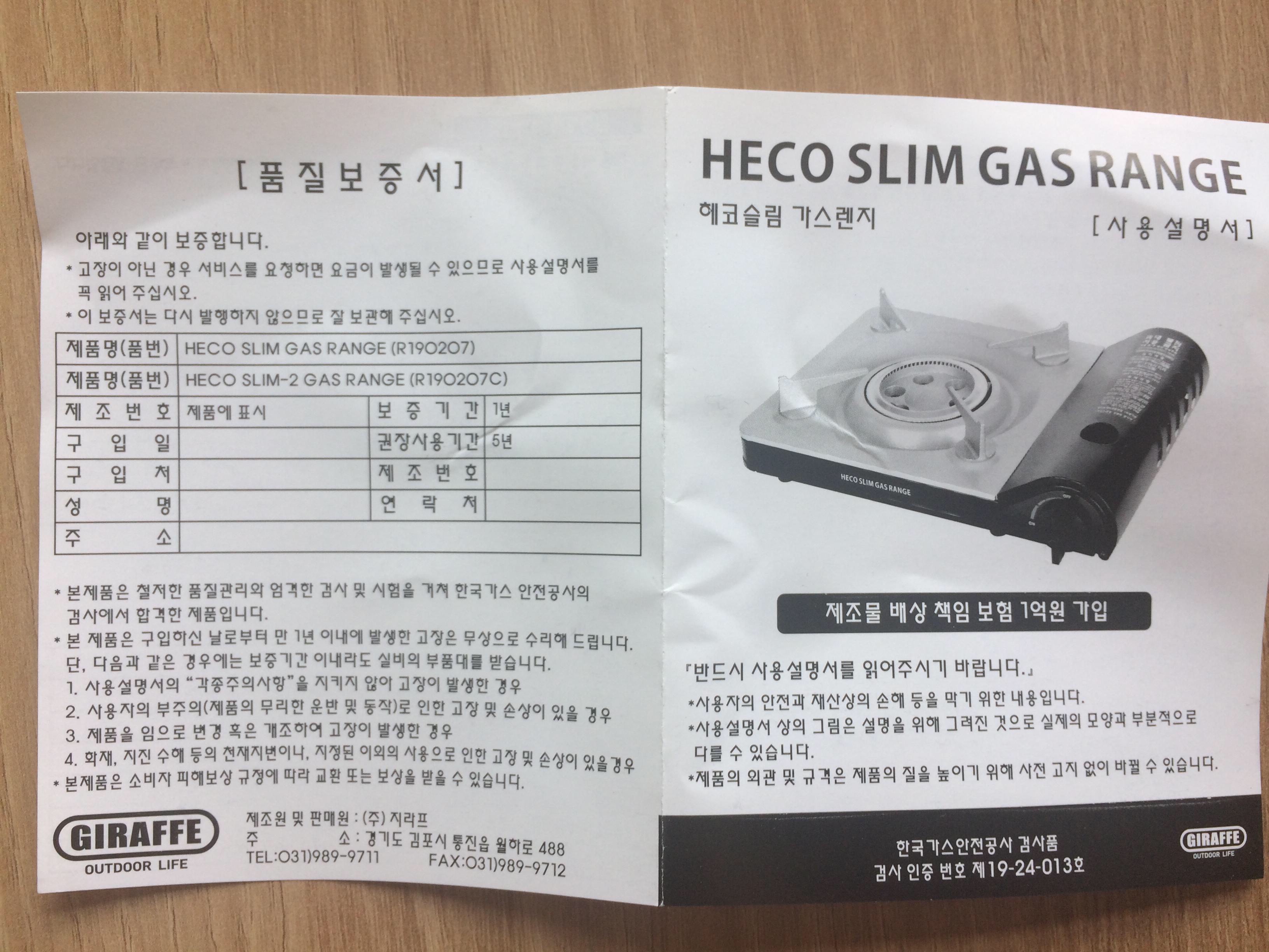 슬림 가스버너 품질보증서
