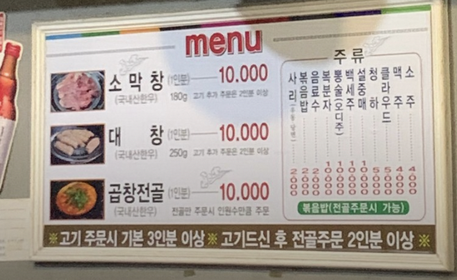 해성막창메뉴가격변천사가게 내부에는 메뉴판이 붙어 있다. 물가 상승을 반영한 막창의 가격이 점점 오르고 있다! 그래도 소막창이니 이정도 가격은 줘야한다?!