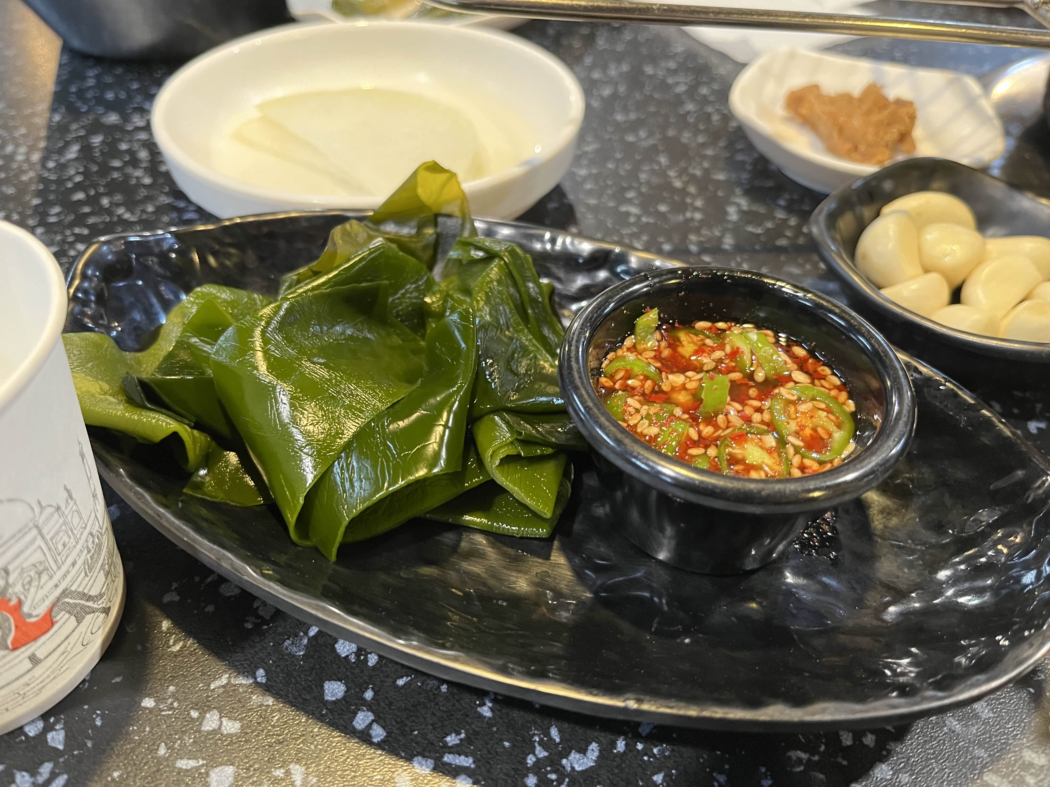 기본 반찬들이 나오지만 그중에 다시마와 액젓장이 기가막혔다! 다시마는 신선하게 맛이 좋았고, 난 찌개가 나오기 전부터 한공기를 다시마와 매운고추로 뚝딱! 된장과 마늘 쌈무 까지 맛이 좋았다.!