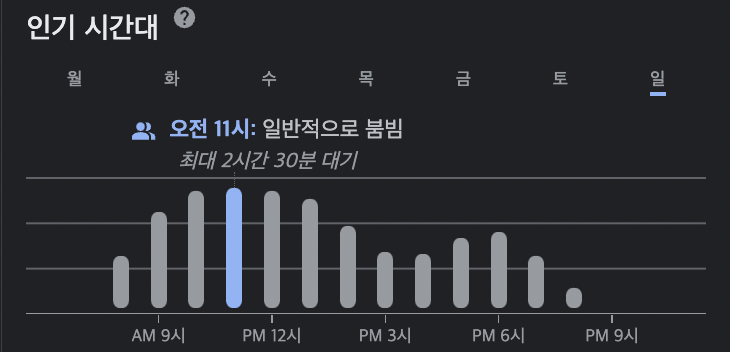 휴무일 : 목요일 / 가장붐비는 요일 : 일요일 / 가장붐비는 시간대 : 오전 11:00 (평균대기 2시간 30분)