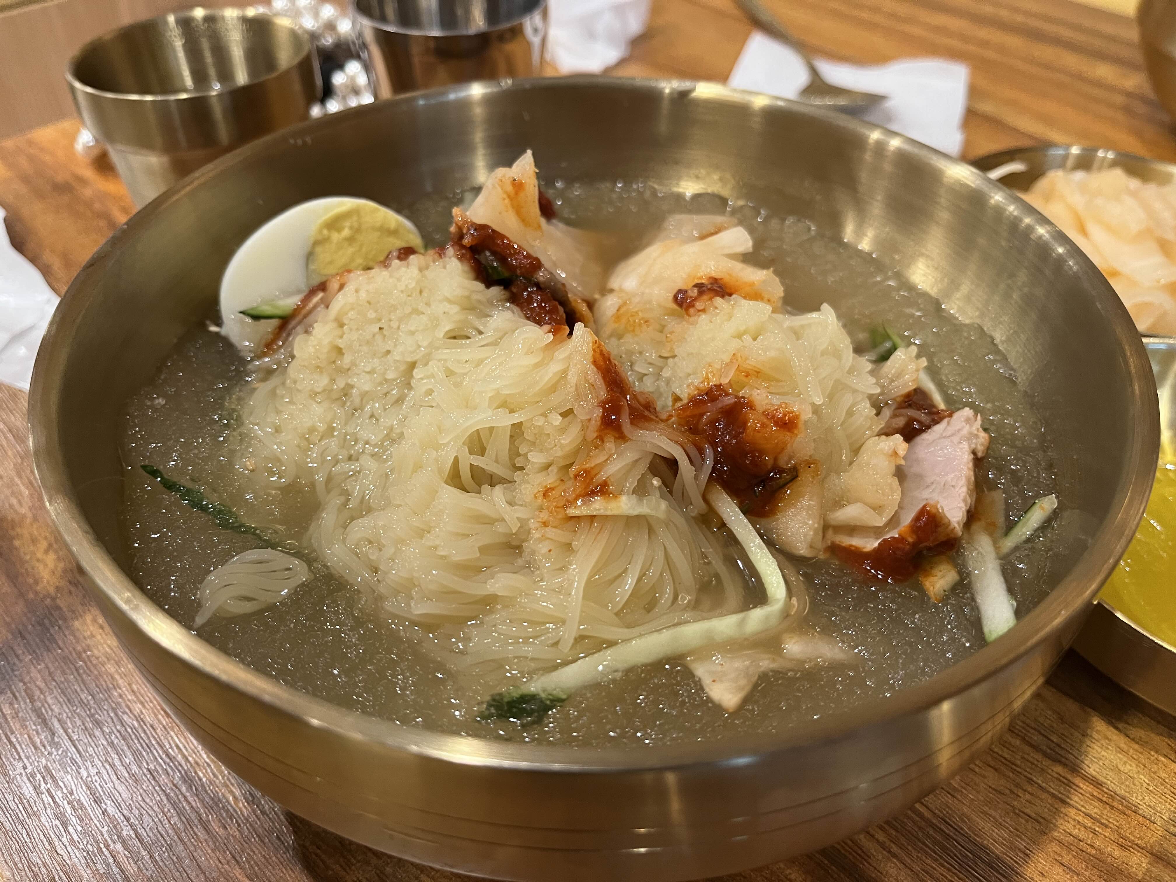 냉면은 얼음 육수가 함께 부어져 나온다. 새초롬한 썰어진 쌈무가 감칠맛을 낸다.!