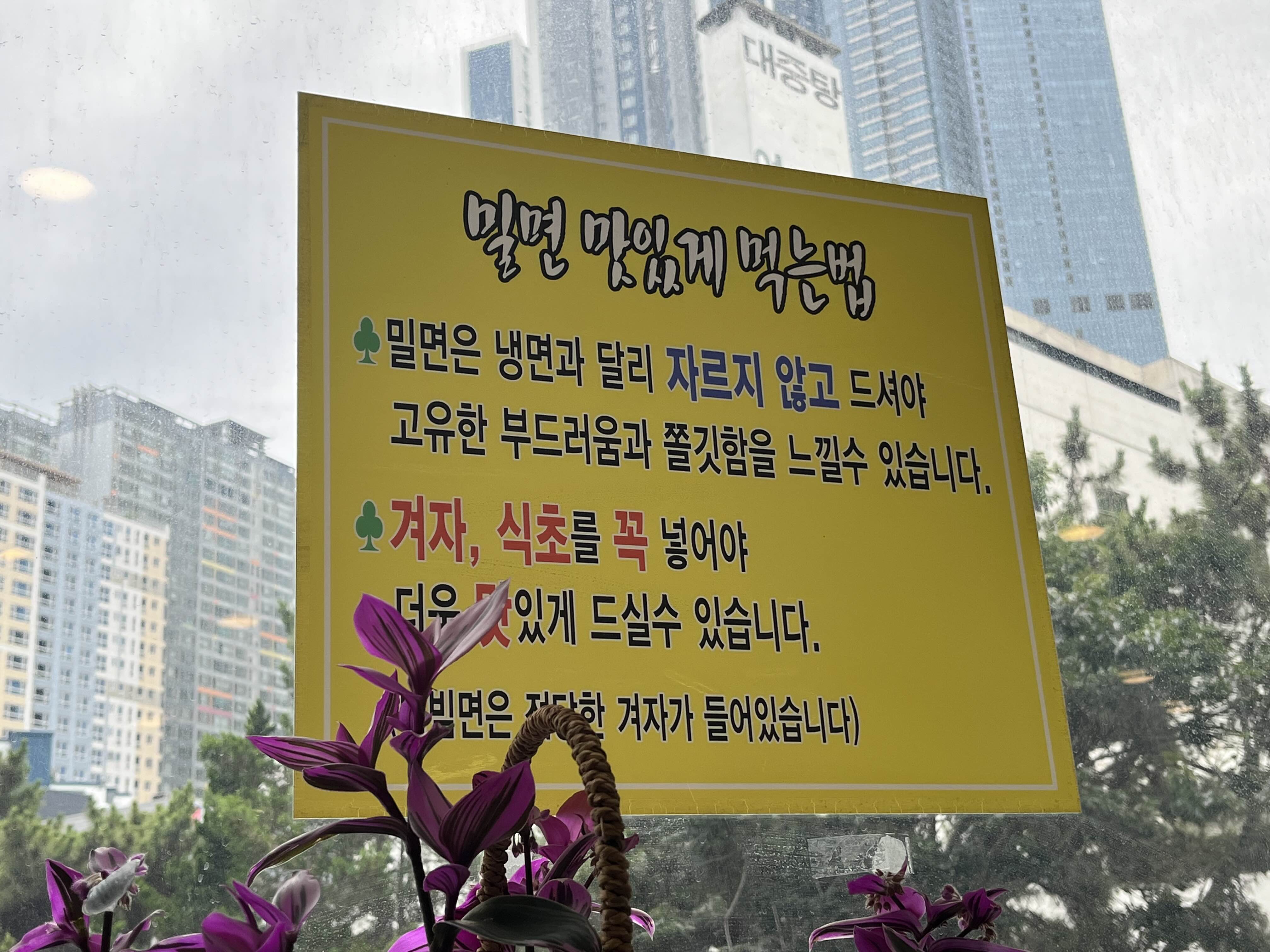 해운대 밀면을 더 맛있게밀면은 냉면과 달리 자르지 않고, 먹어야 부드러움과 쫄깃함을 느낄 수 있다.! 겨자 식초는 필수다!