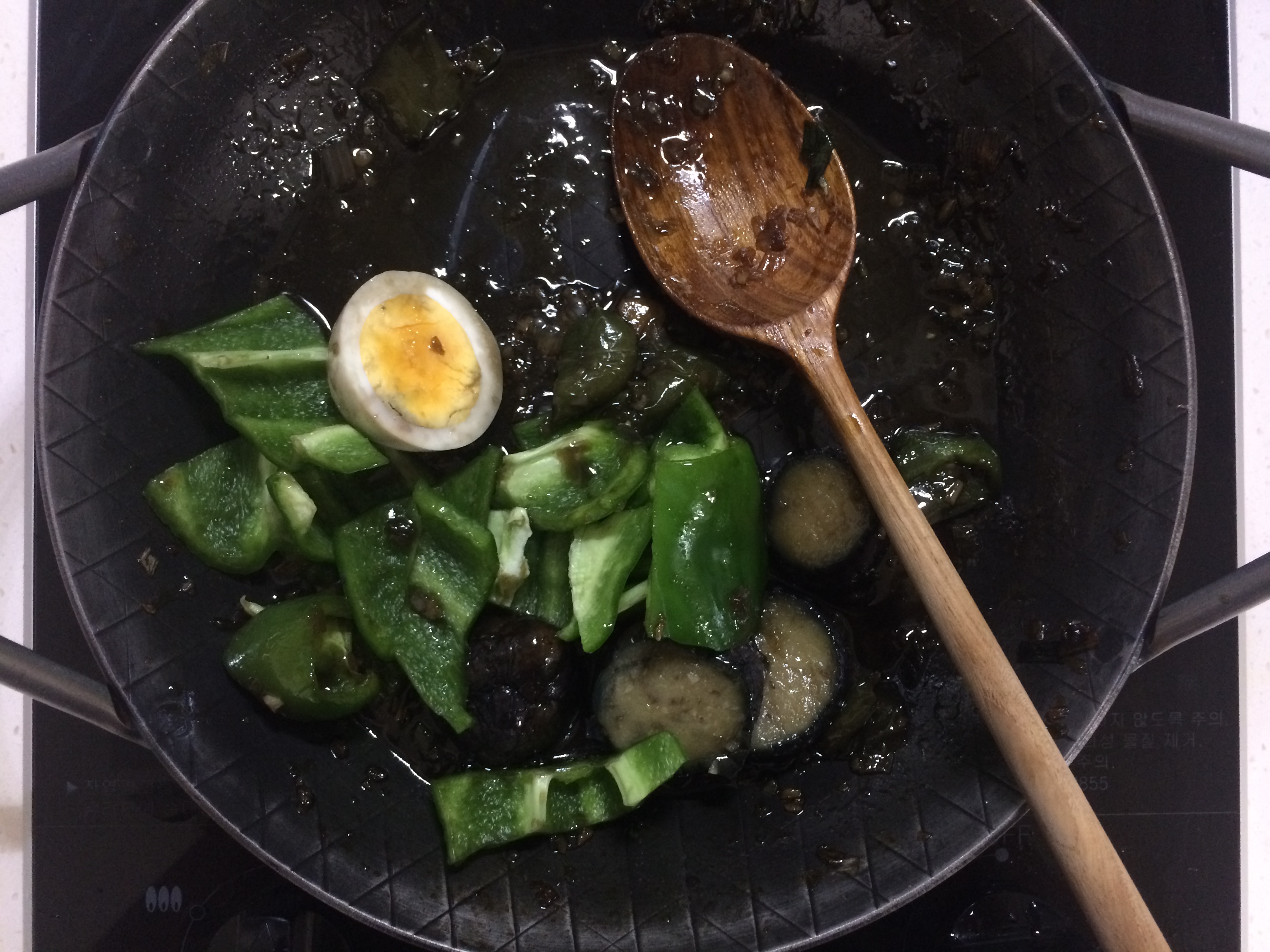 약간의 기름 연기가 나면 불을 중불로 낮추고 가지, 피망(난 파프리카), 감자 로 끼리 끼리 튀겨준다 (감자가 제일 오래 걸리고.. 맛이 없다.ㅋ)