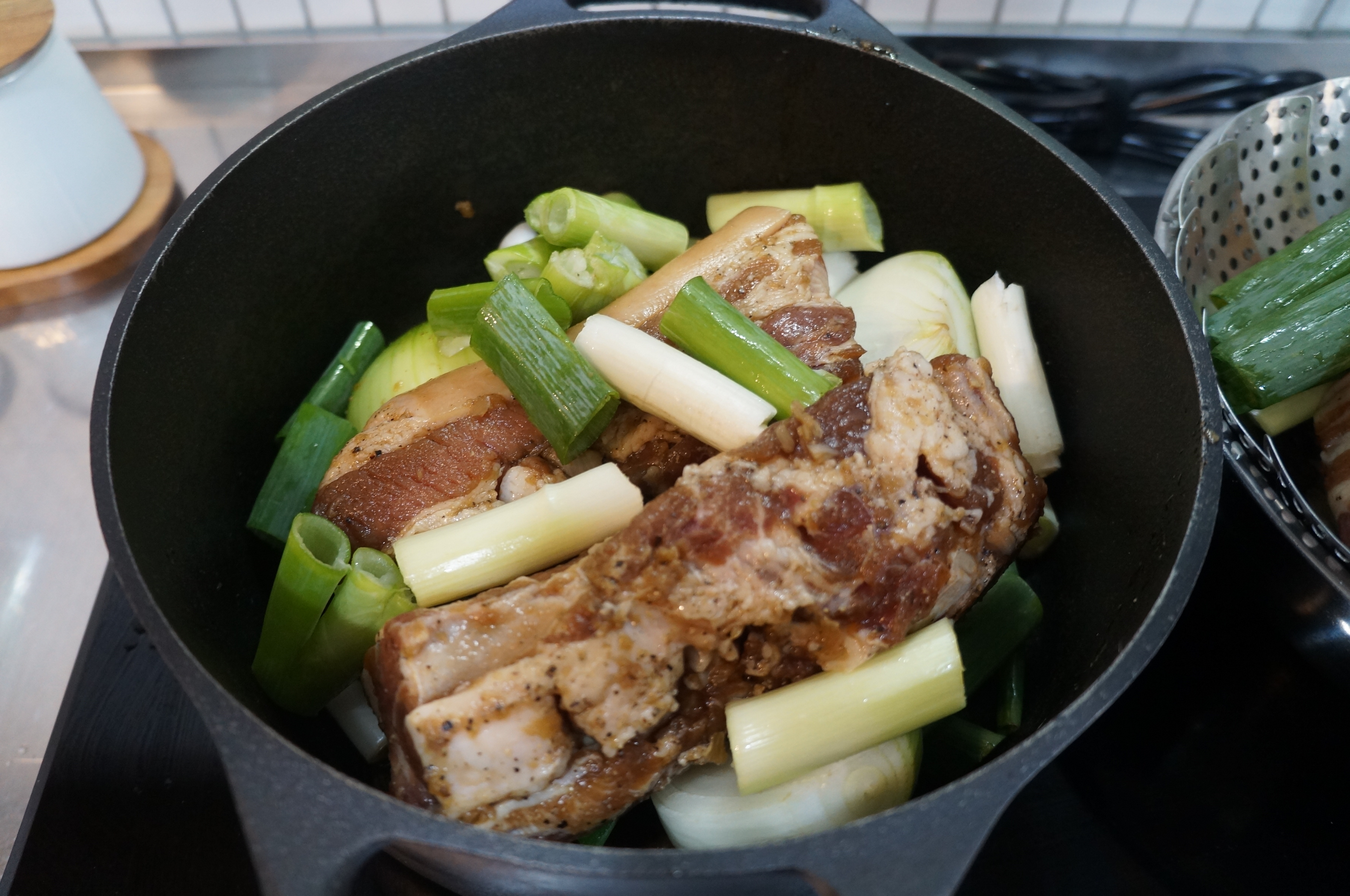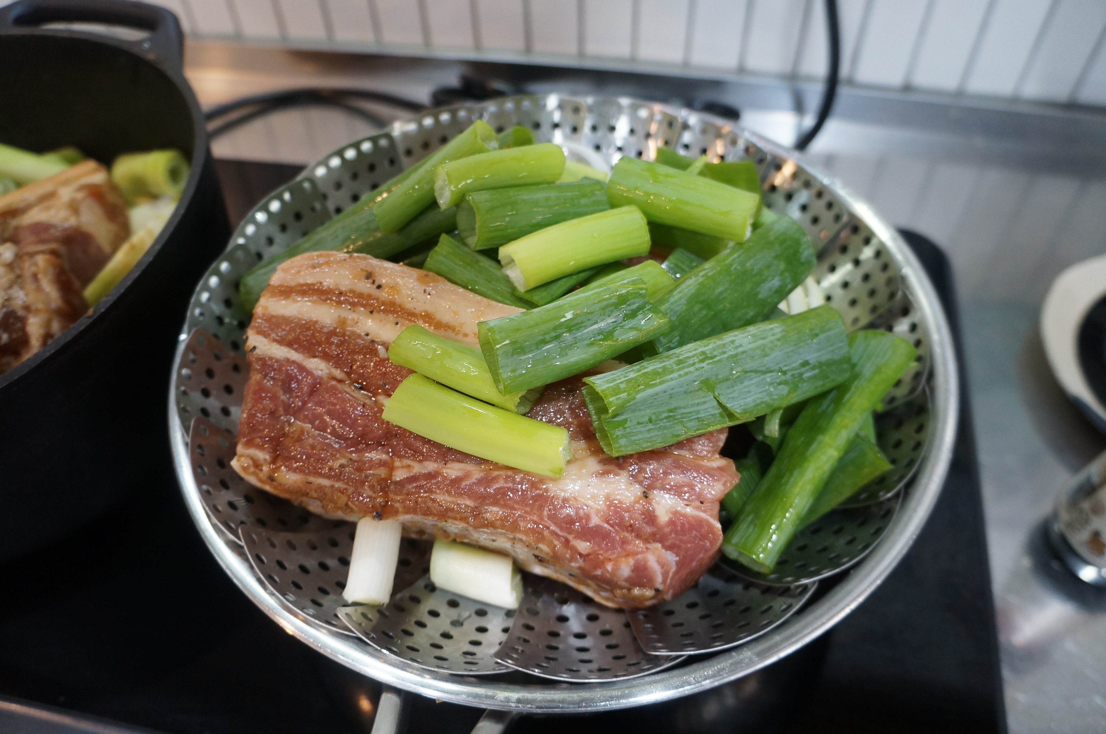 보쌈을 준비하는 과정에서 꼭 필요한 반찬과, 어디에 삼겹살을 어떻게 삶아야 하는가? 항상 이게 고민이었다!. 그래서 이번에는 무쇠솥과 스테인레스 냄비를 준비하였다. 무쇠 솥은 스켑슐트! 그리고 스테인레스 제품은 퀸센스 ! 스텐 vs 무쇠 로 대결을 해보았다. 지난번에는 주로 무쇠(스켑슐트)로 해봤는데, 어느순간 쇠맛?이 나는게 좀 느껴졌다. 이건 분명 무쇠의 성분에서 나오는 맛일듯.! 이건 시즈닝과 상관없이 발생하는 현상으로 이해된다. 그래서 스테인레스 에는 스팀받침대를 까로 아래에 양파를 깔아주었다.