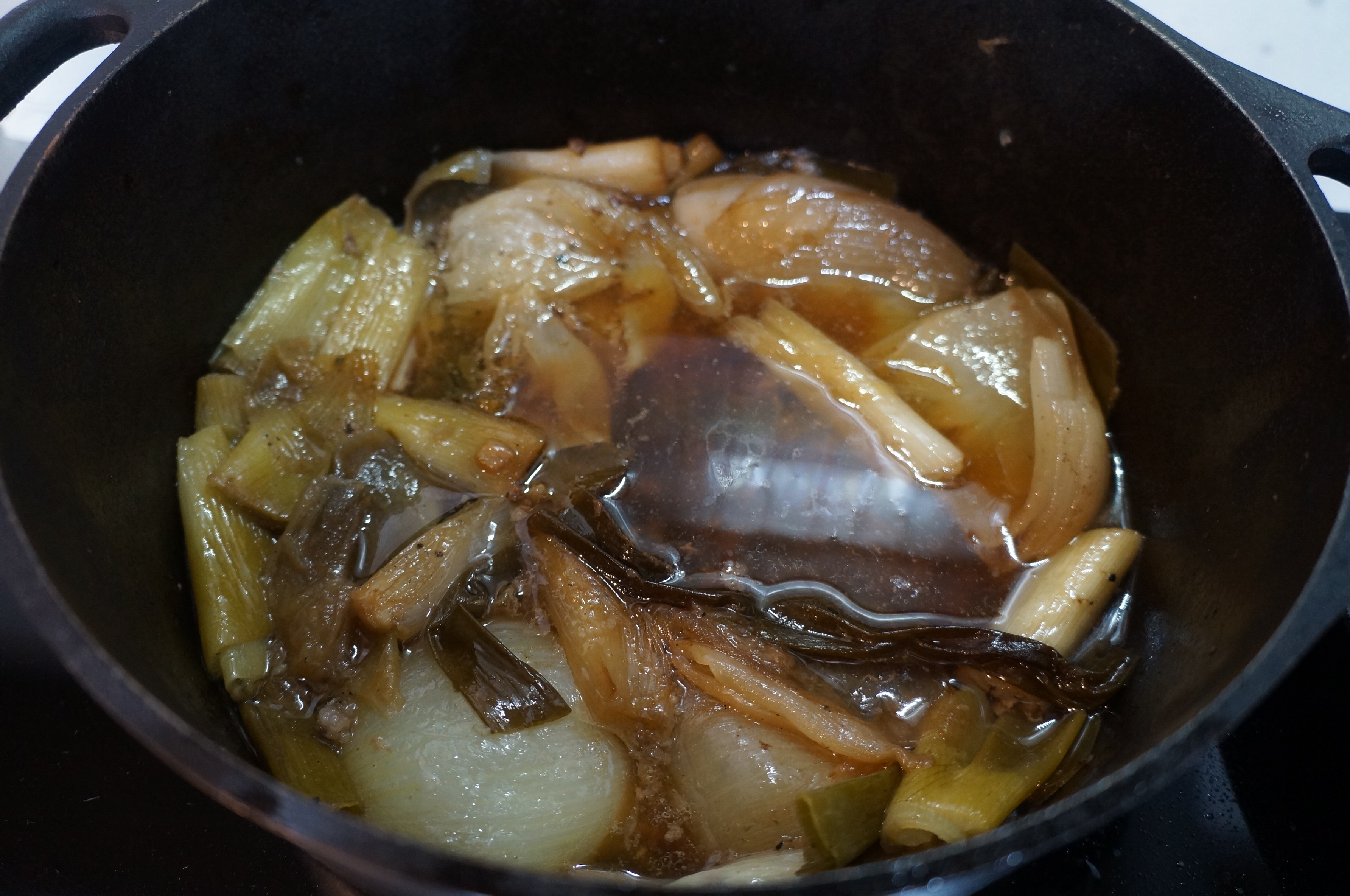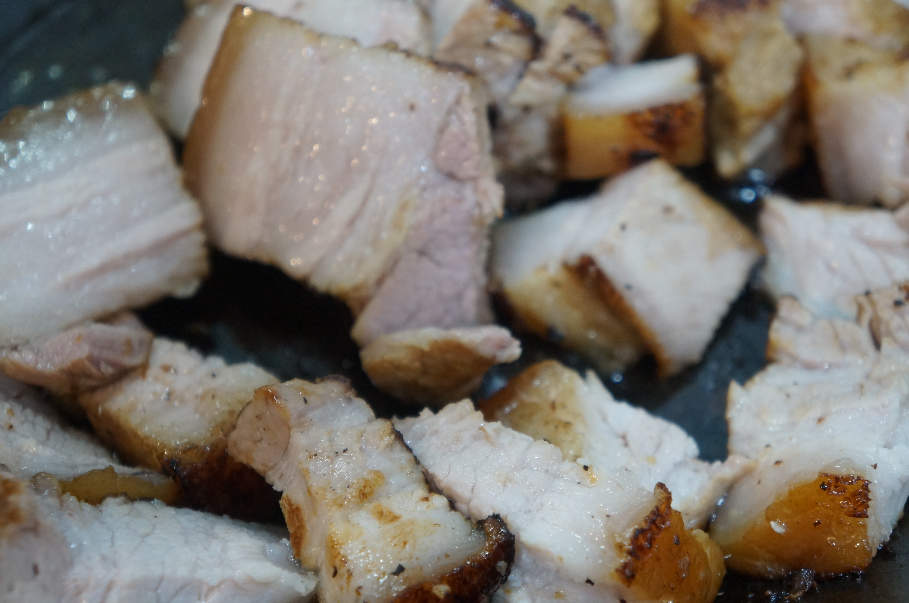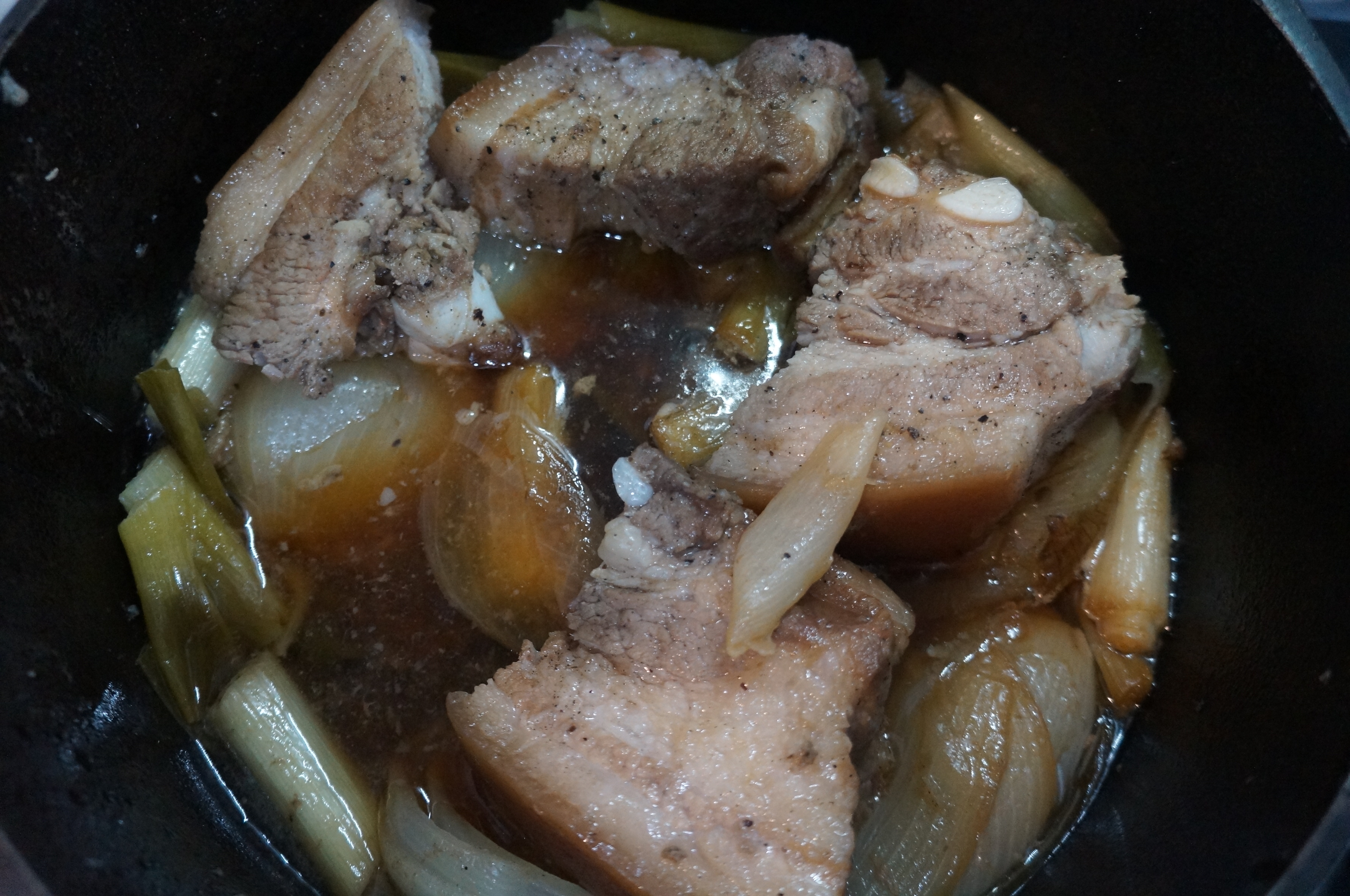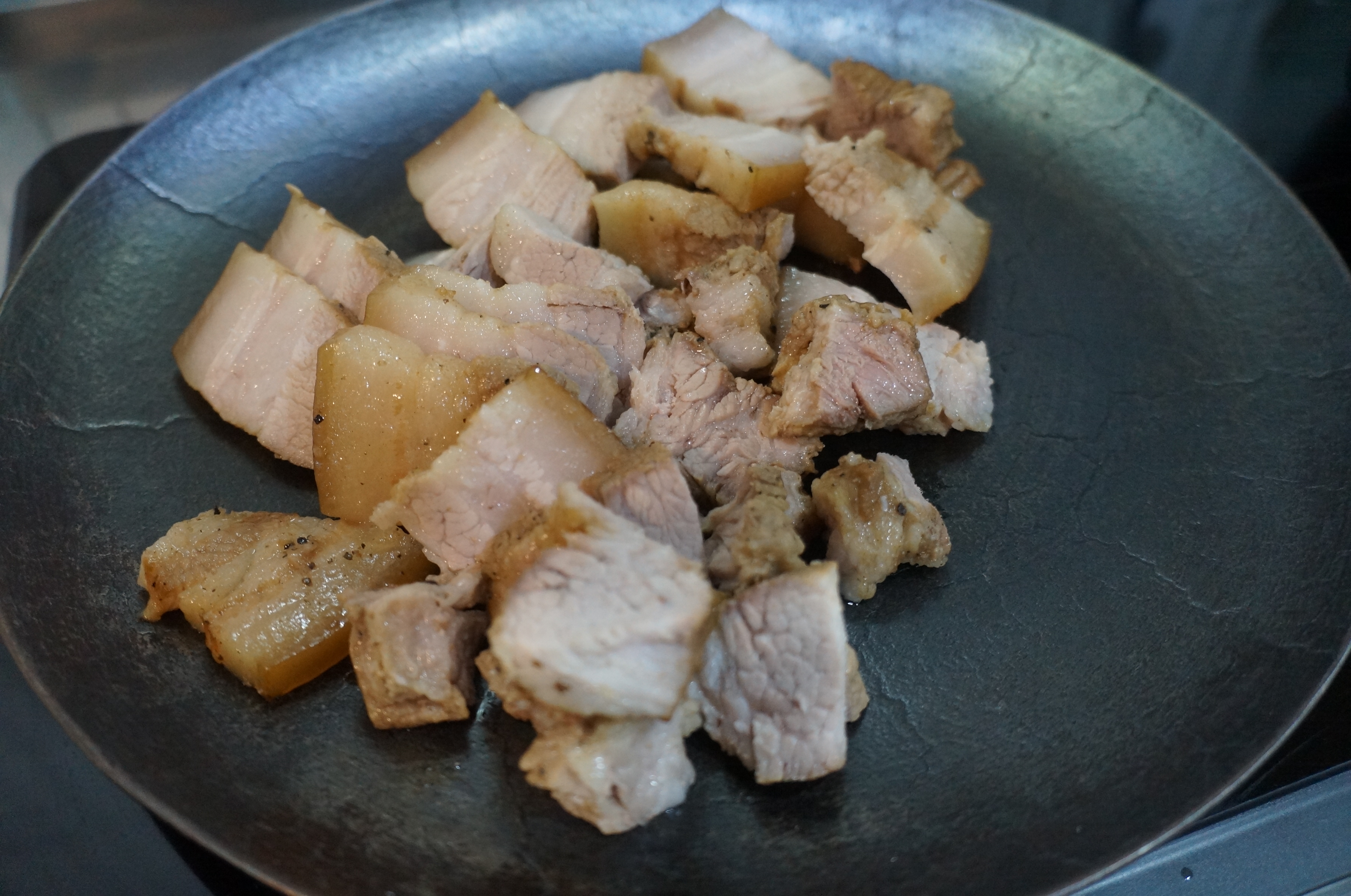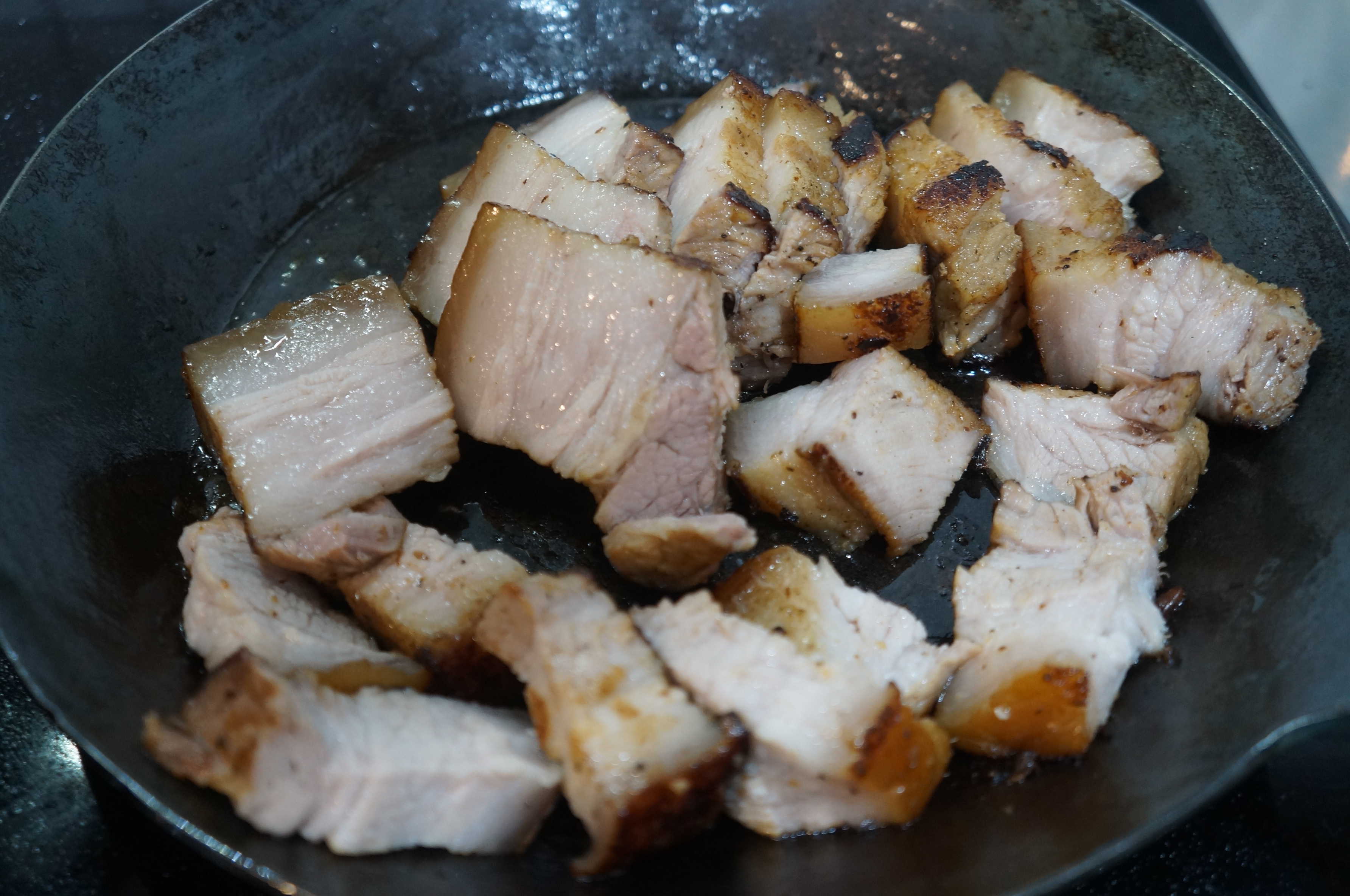 두번째는 남은 육수를 가지고 구워주었다, 아래에 녹아나온 기름과 이미 염지된 육수가 향이 너무 좋아서 스테인레스 팬에서 만들어진 보쌈을 구우면서 썰어주면 끝!, 육수에도 맛의 차이가 확실이 났다. 스테인레스 팬에는 추가된 참치액과 양파 그리고 미림이 육수를 기가막히게 만들어 주어서 나중에 남은 육수를 볶음밥 할때 사용하기도 좋았다.
