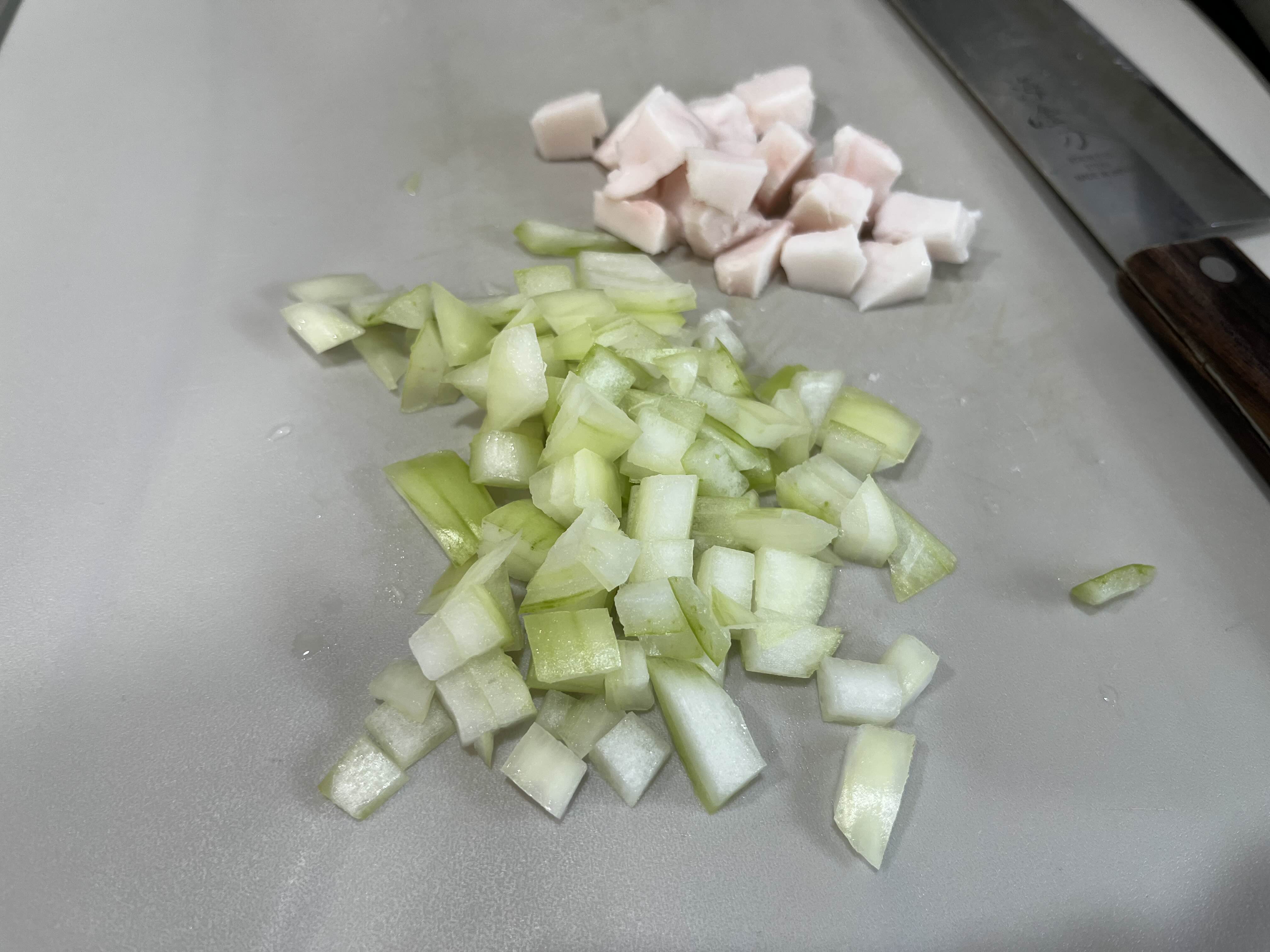 양파썰고, 돼지비계 썰고, 익혀주고, 춘장으로 볶아준다. 삶은 면과함께 버무려 먹기!!