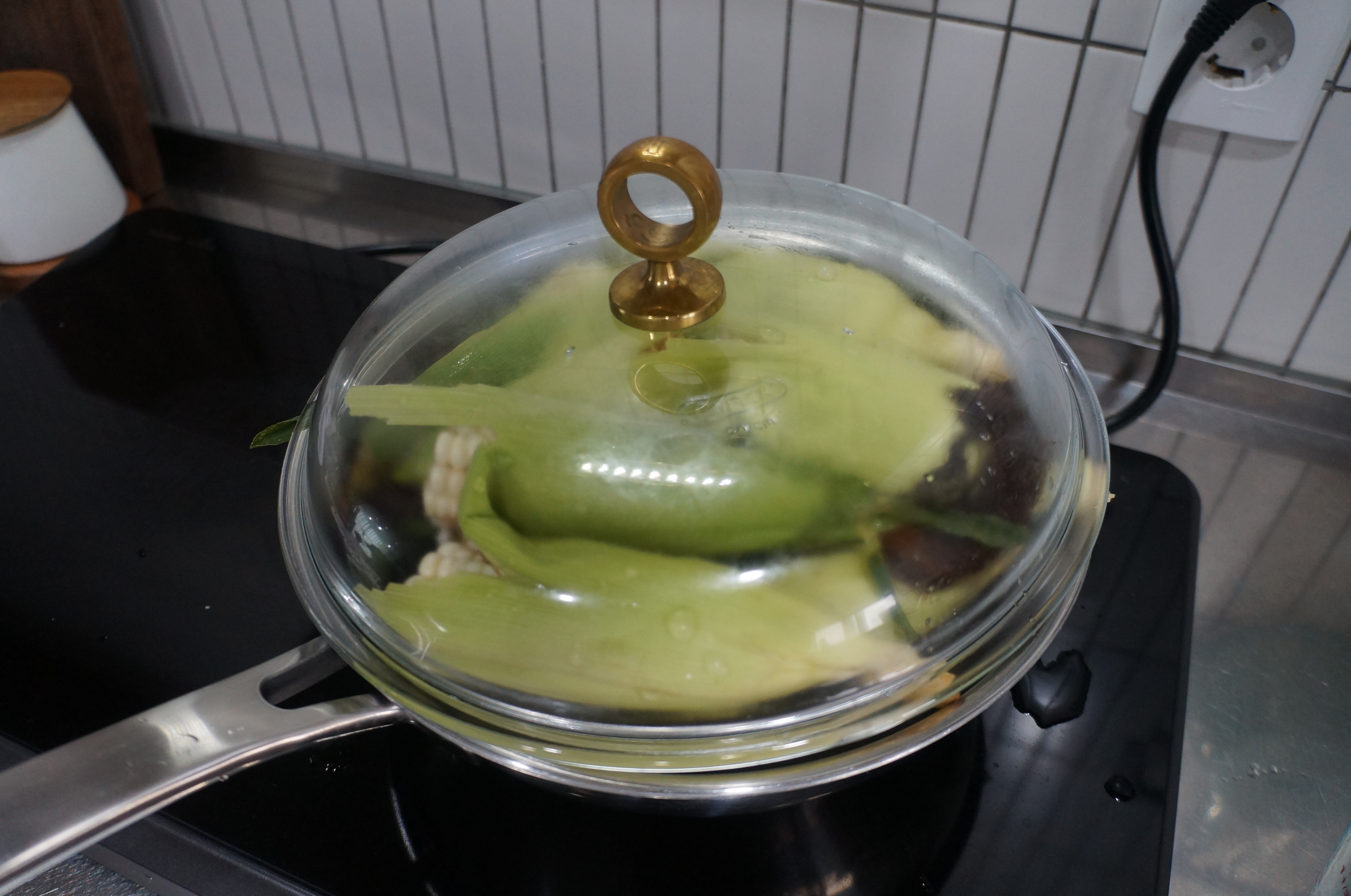 5. 젓가락이나 포크 등으로 옥수소의 익음 상태를 확인합니다. 부드럽게 꿀꺽하면서 식감이 좋아졌다면 적절한 익음 상태입니다.