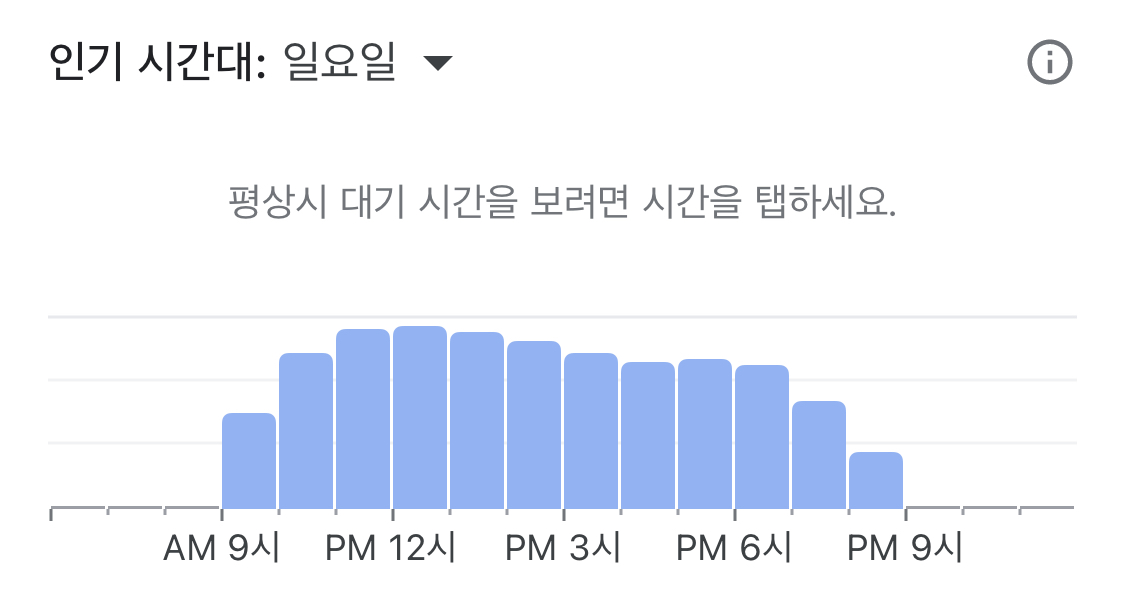 일요일이 가장 붐비고, 금요일이 가장 조용하다고 평균적으로 나옴. 여유가 된다면 점심이후 시간대를 추천!