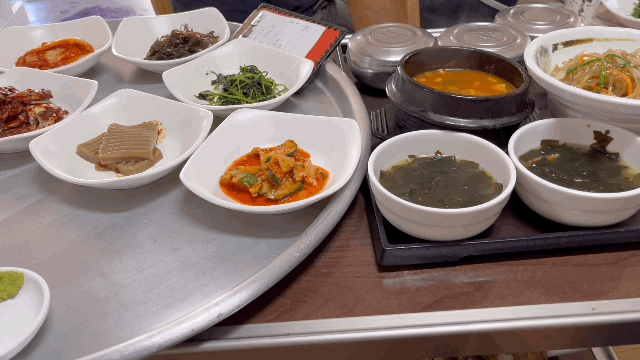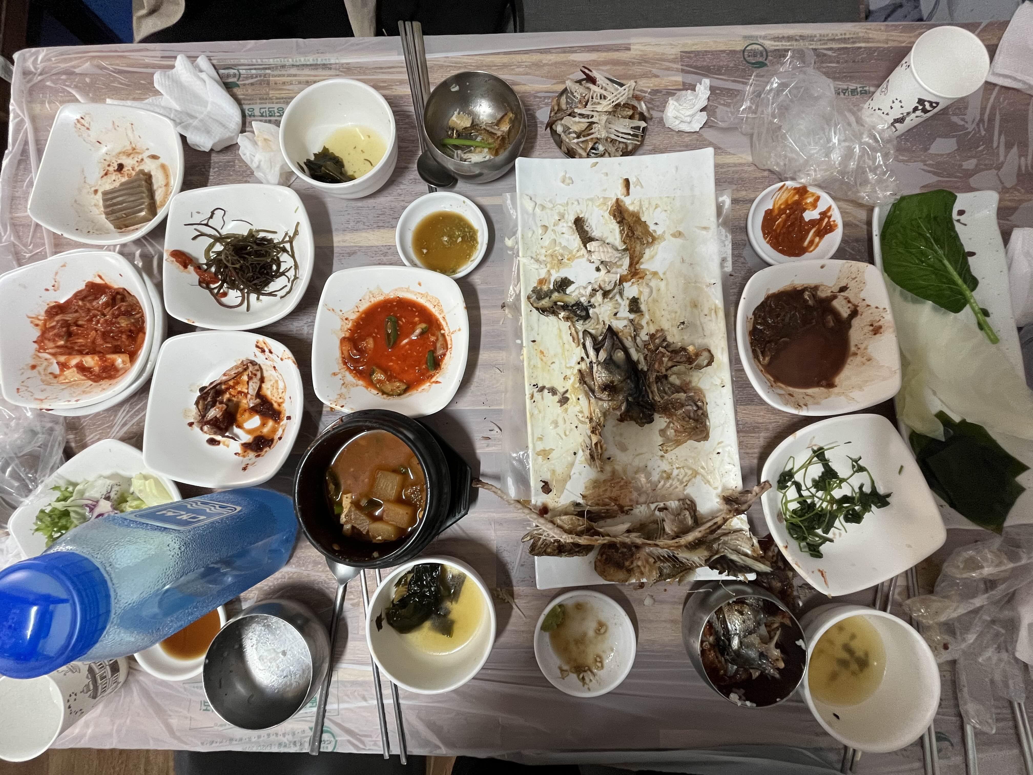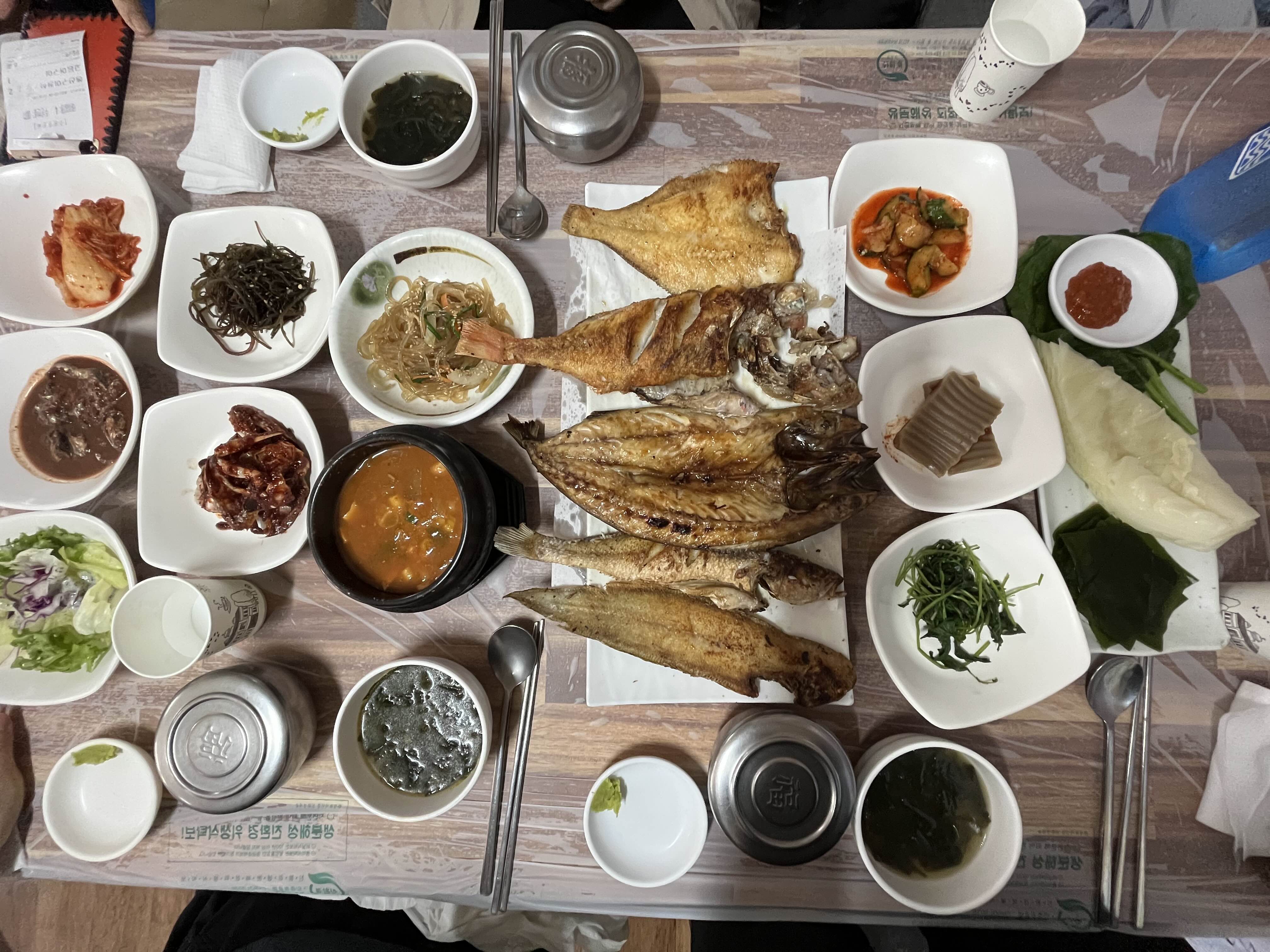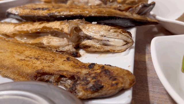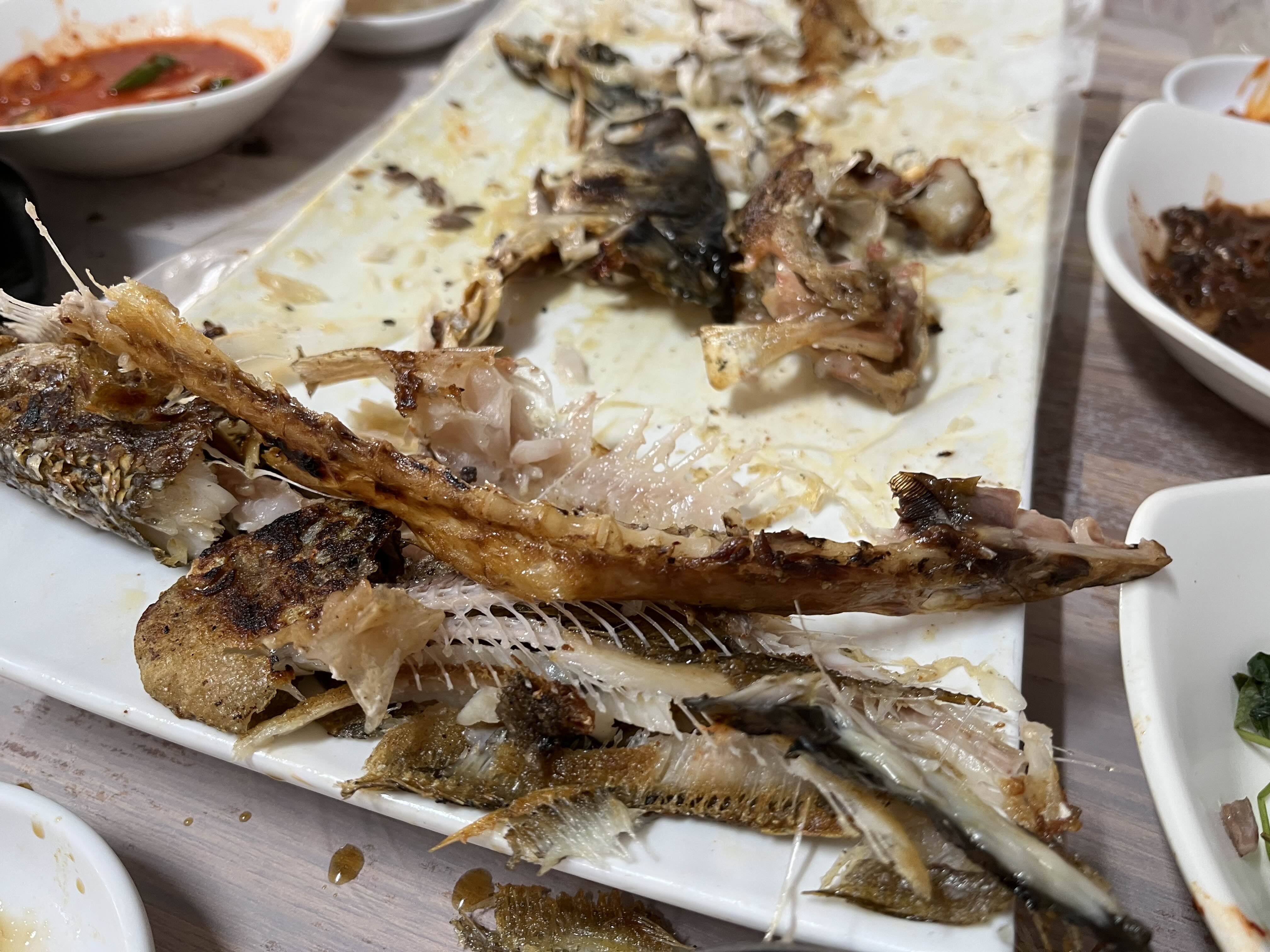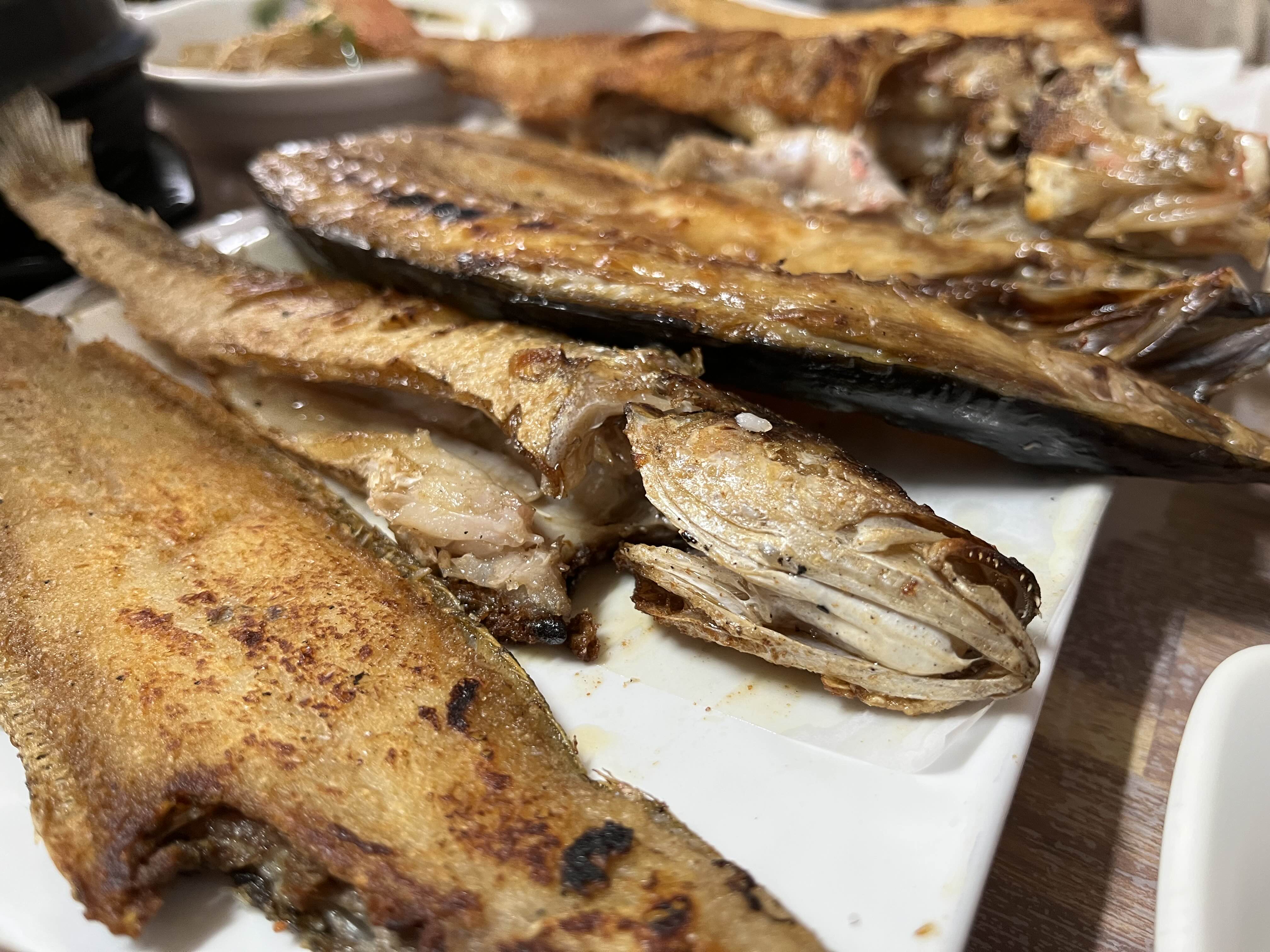 생선 등장! 3인분!! 어촌밥상은 상차림이 한가득이다.! 3인기준으로 정식2+고등어1로 주문을 했고, 조기, 열기, 가자미, 서대, (꽁치는 계절마다 바뀌는듯) 그리고 고등어!! 우리는 5마리가 나왔다.! 모두가 나름의 맛을 가지고 있다.! 집에서 먹을때랑.. 그리고 자갈치 시장입구의 고등어 구이 정식과 비교해도 좋다! (물론 둘다 뛰어남)