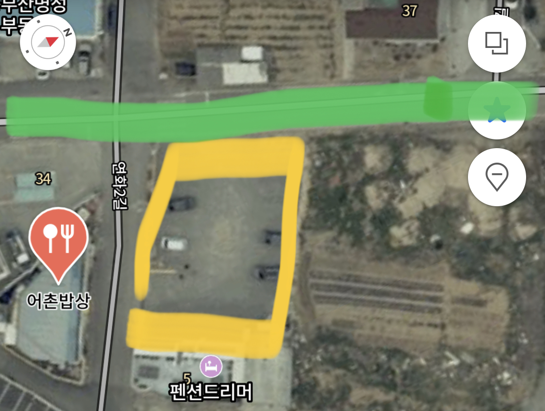 노랑색 주차장 / 초록색 버스경로(왕복1차) 어촌밥상 건물