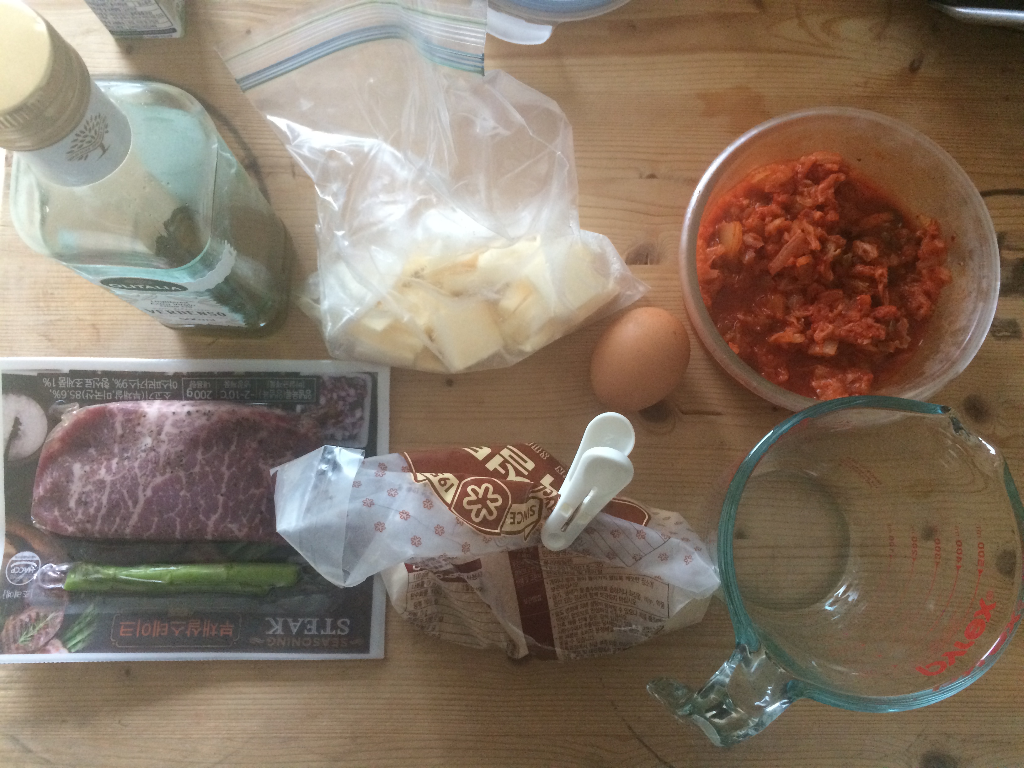재료 - 김치(잘익은거... 젤 중요) , 터크팬, 운틴미니찌개 냄비, 부채살, 설탕, 대파, 양파, 간장, 고추가루, 김자반(선택), 계란, 버터, 식용유, 올리브유