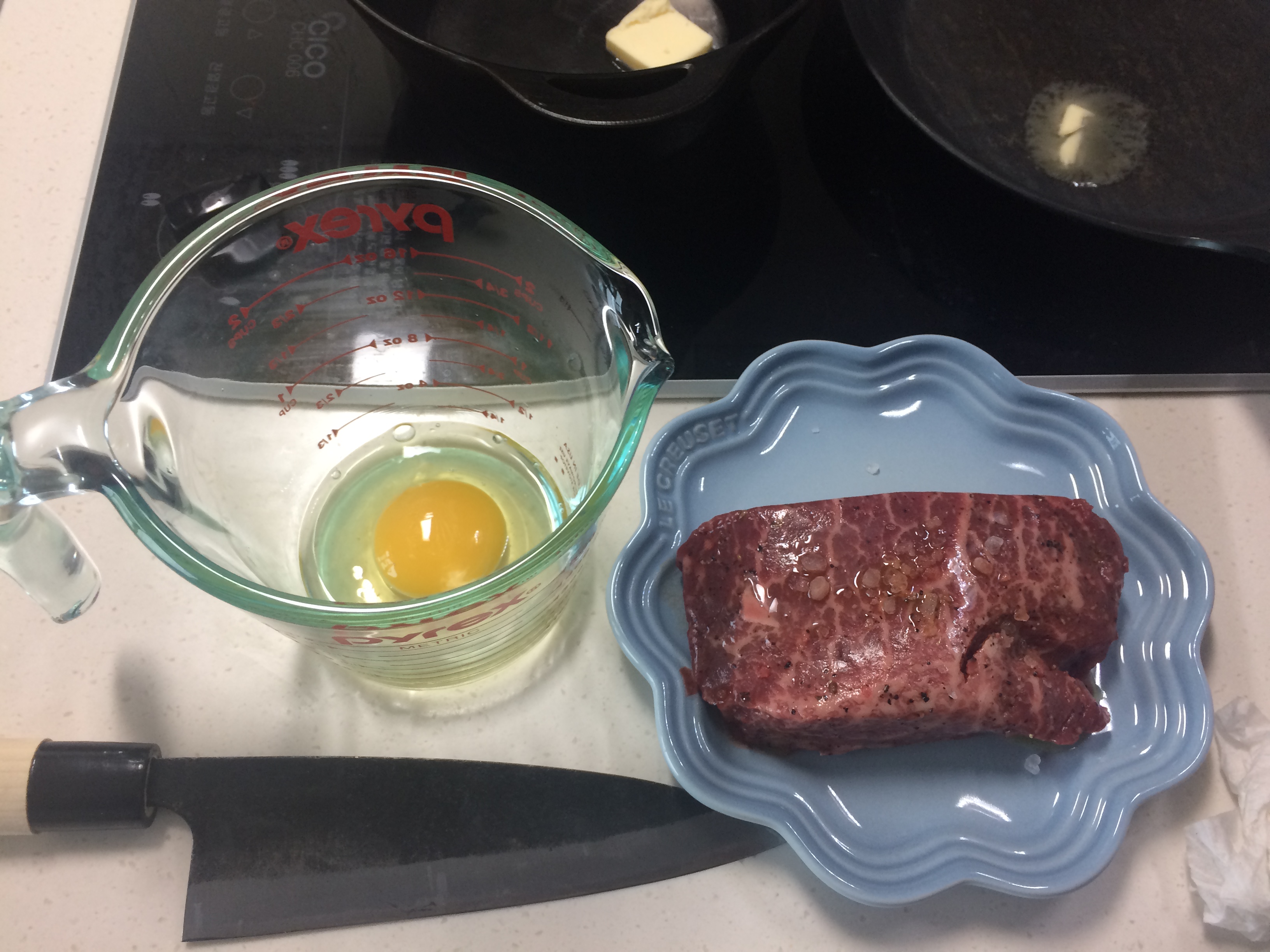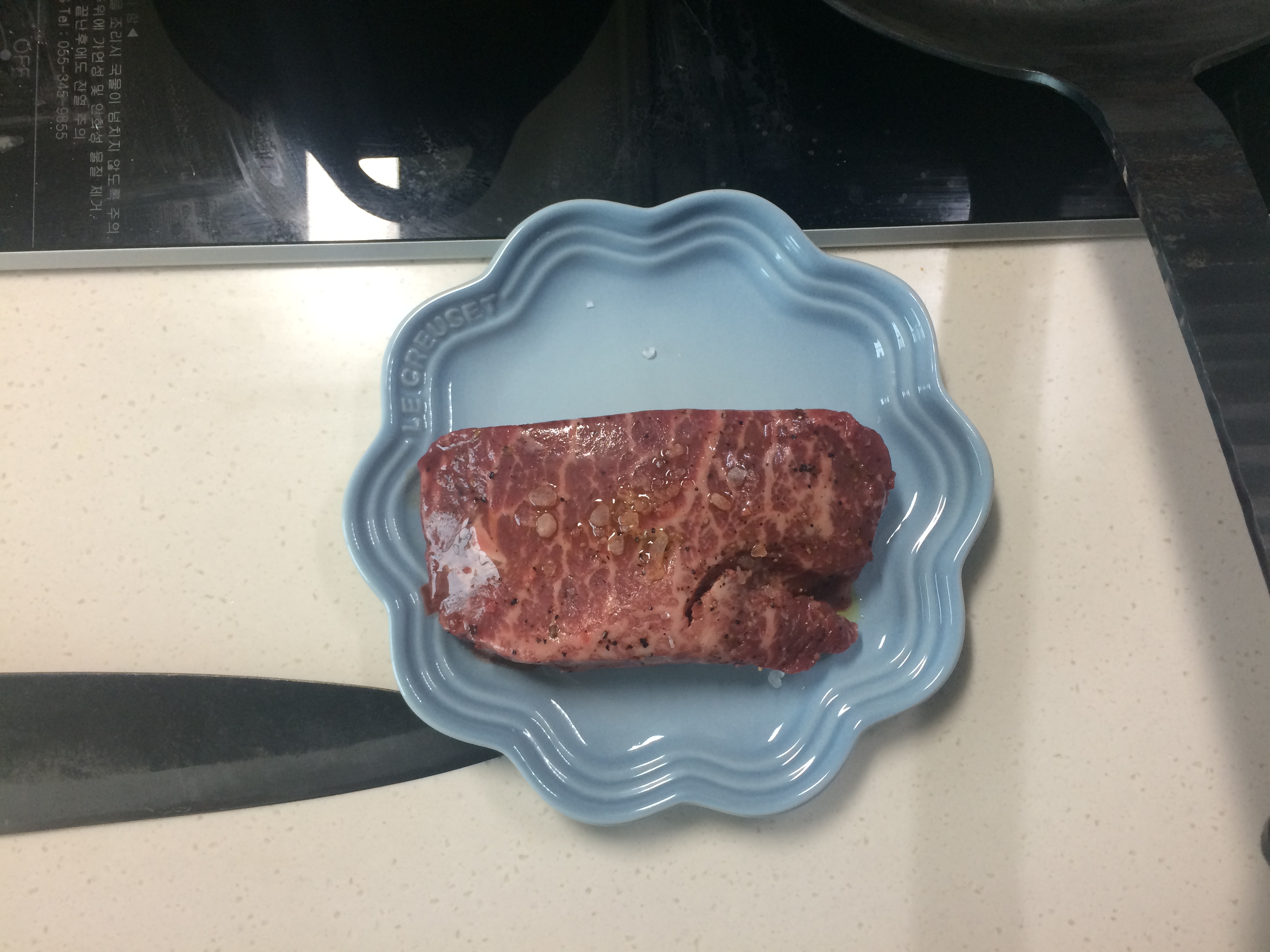 0. 양파 김치 파를 썰어주고, 스테잌(난 돈이없어 채끝 대신 부챗살.. ㅋ )을 드레싱. / 계란을 컵에 풀어둔다.