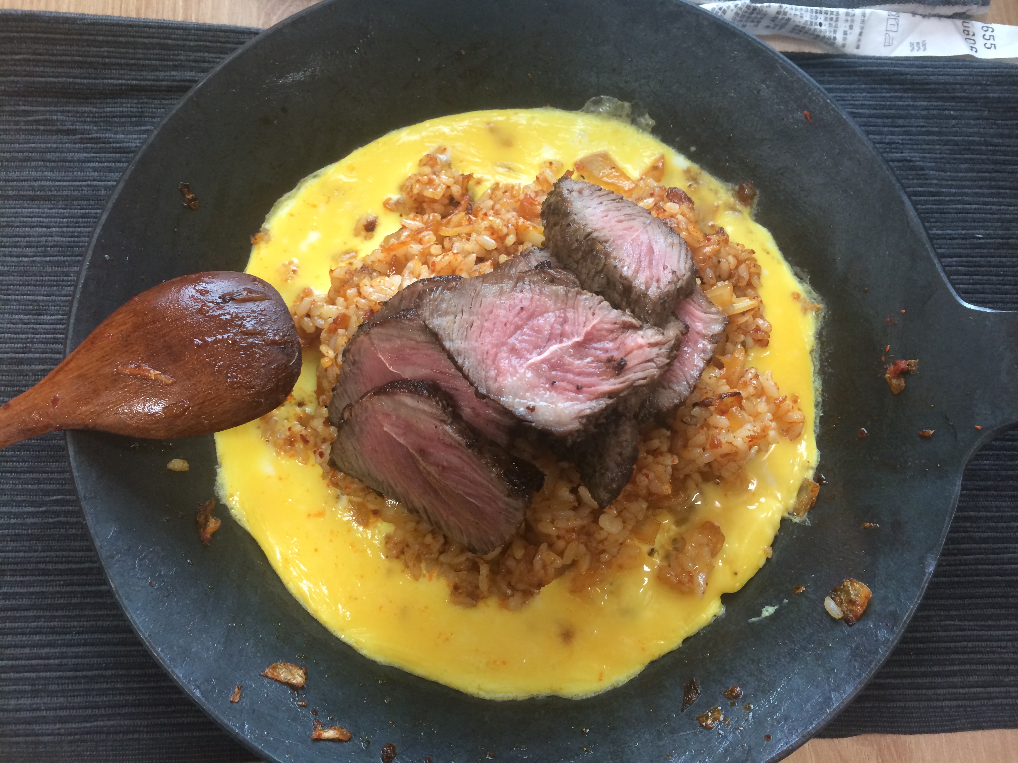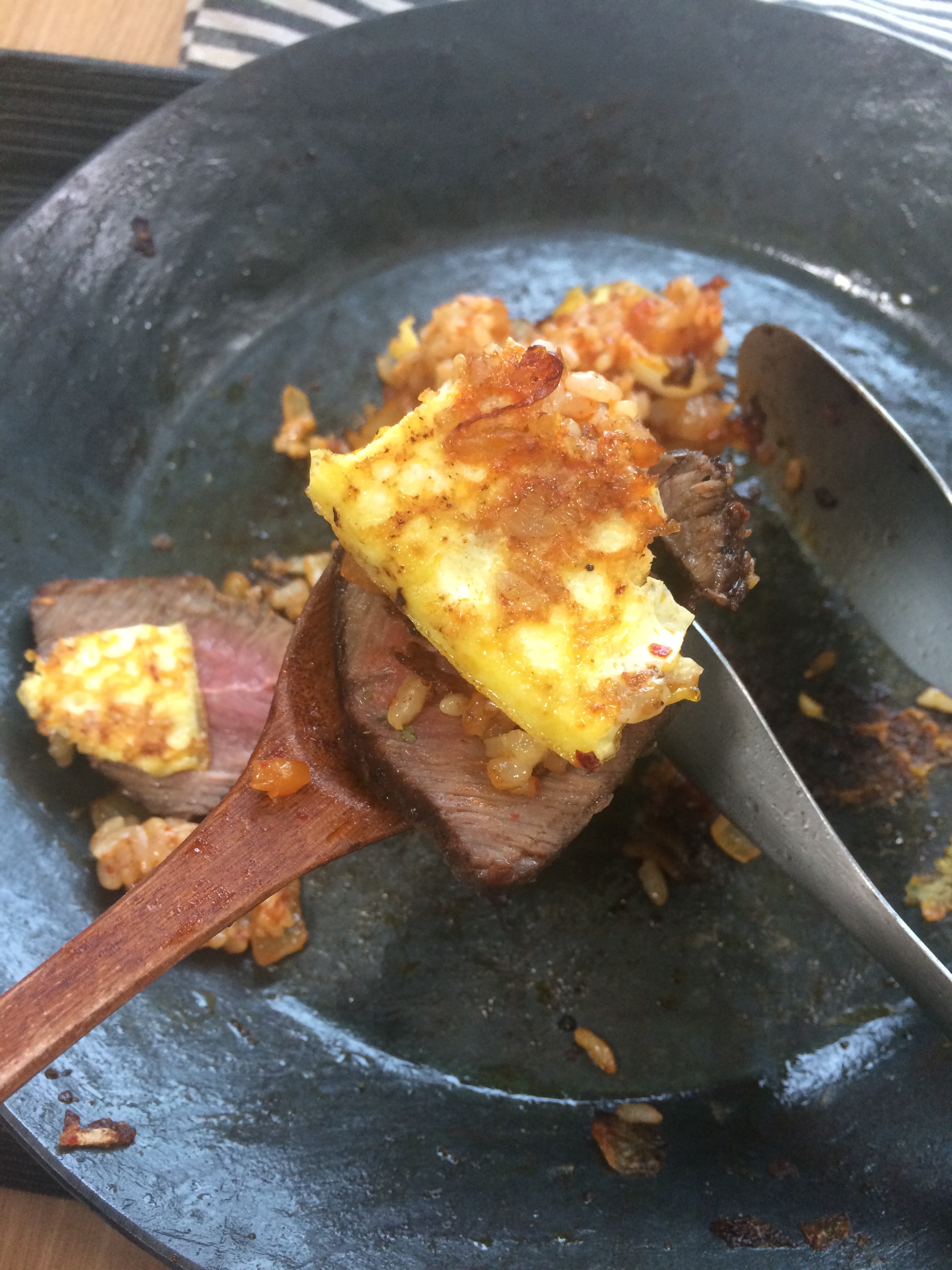 6. 스테잌이 익을즈음에 터크팬에 밥을 넣어서 중불로 볶아준다.