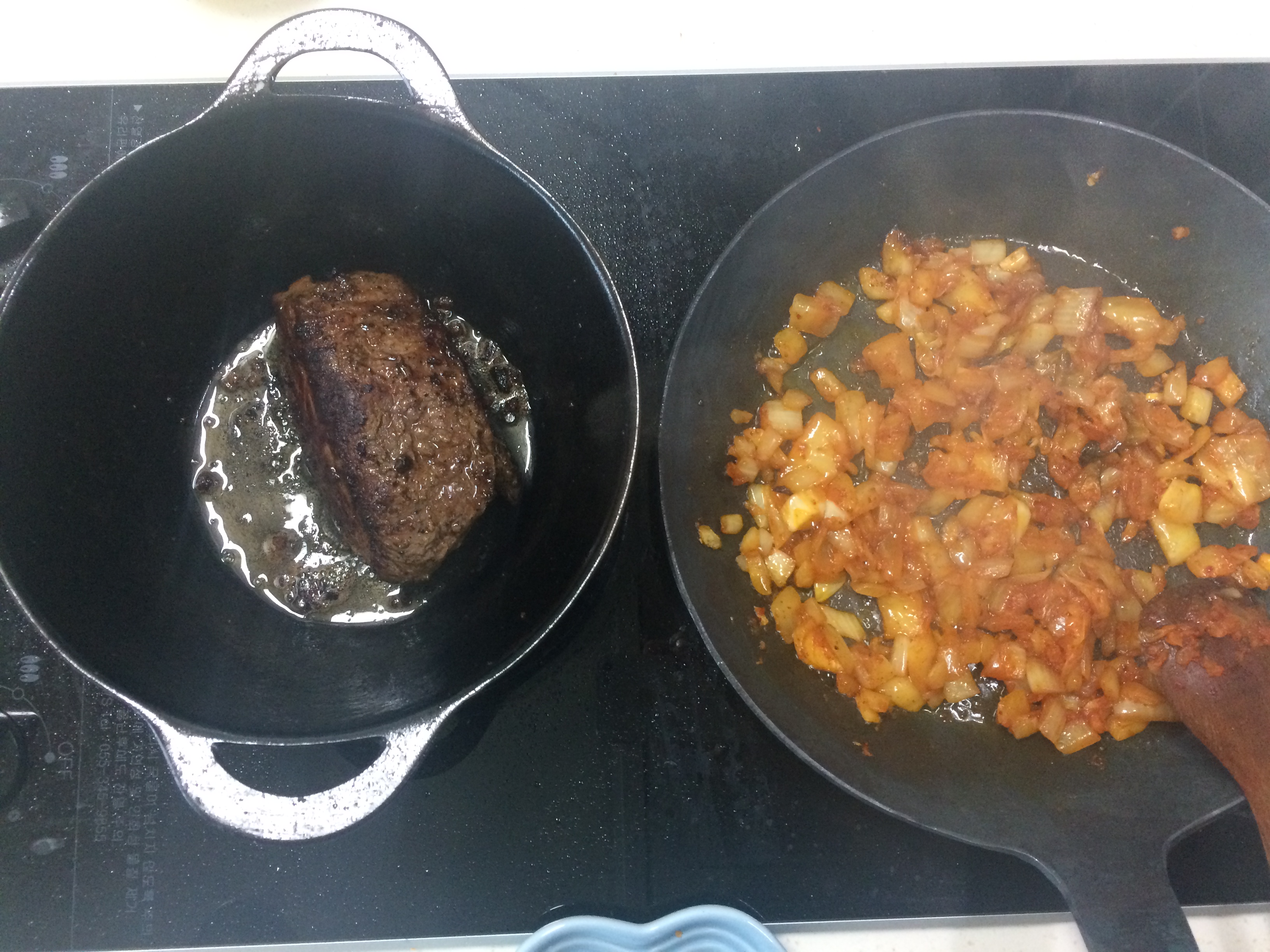 4. 스테잌을 구워주며, 터크팬에 파 양파 김치 순으로 넣어준다. 가능한 약 중불로..(고기를 더 먼저 구워야 함)