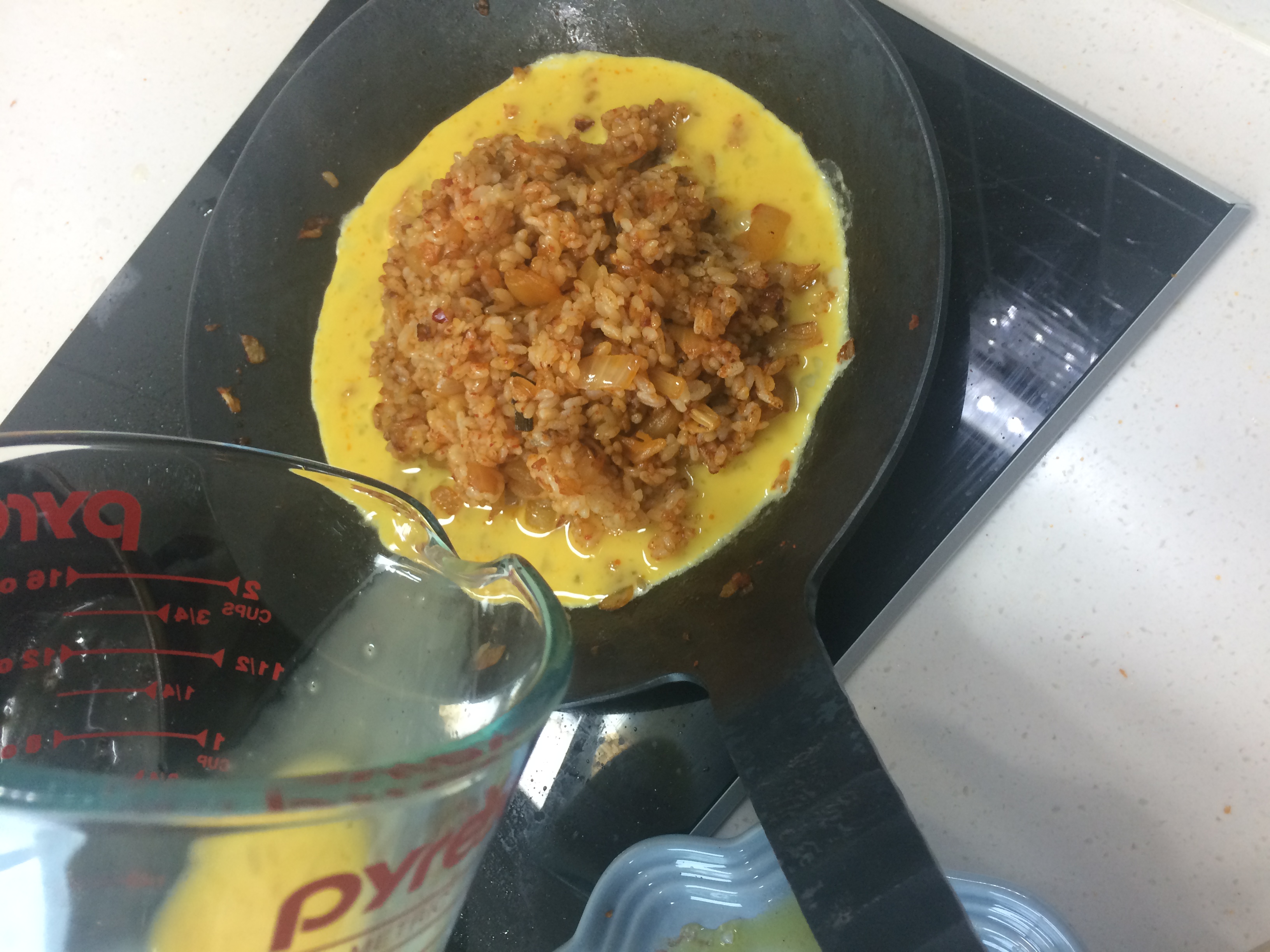8. 터크팬에 마무리된 밥을 가운데 모으고 풀어둔 계란을 테두리로 싸악~ 부어준다. (나름 요리사기분남)
