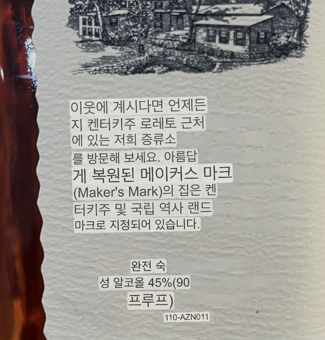 미국 수제 버번 위스키인 메이커스 마크(Maker's Mark)는 모두 6대째 켄터키 증류소를 운영하고 있는 나의 할아버지 빌 사무엘스 시니어(Bill Samuels, Sr.)가 그의 가족이 만든 위스키에 관심이 없었기 때문에 시작되었습니다. 그래서 1953년에 그는 가문의 요리법을 말 그대로 불태우고 다시 시작했습니다. 그의 미각 비전은 부드럽고 풍부하며 크리미하고 풀바디하면서도 균형 잡힌 버번이었습니다. 그 사이에 우리 할머니 마지(Margie)는 당신이 들고 있는 병을 디자인하느라 바빴습니다. 사실 모든 병을 빨간색 왁스에 직접 담그는 것이 그녀의 아이디어였습니다. 오늘날까지도 메이커 마크를 소량씩, 한 번에 조금씩 만드는 일은 여전히 가족의 일입니다. 즐기십시오.! 아래의제품은 750ml