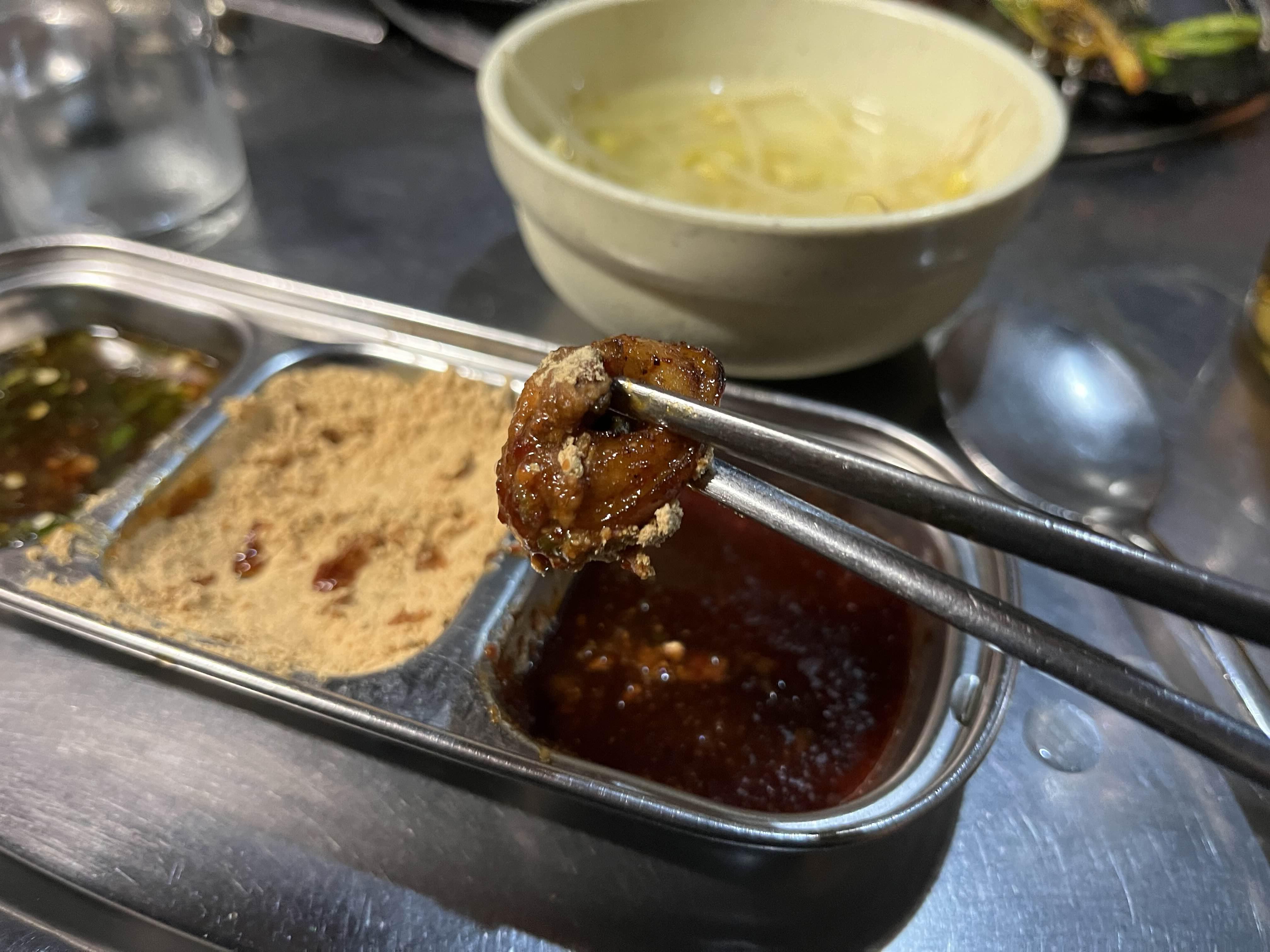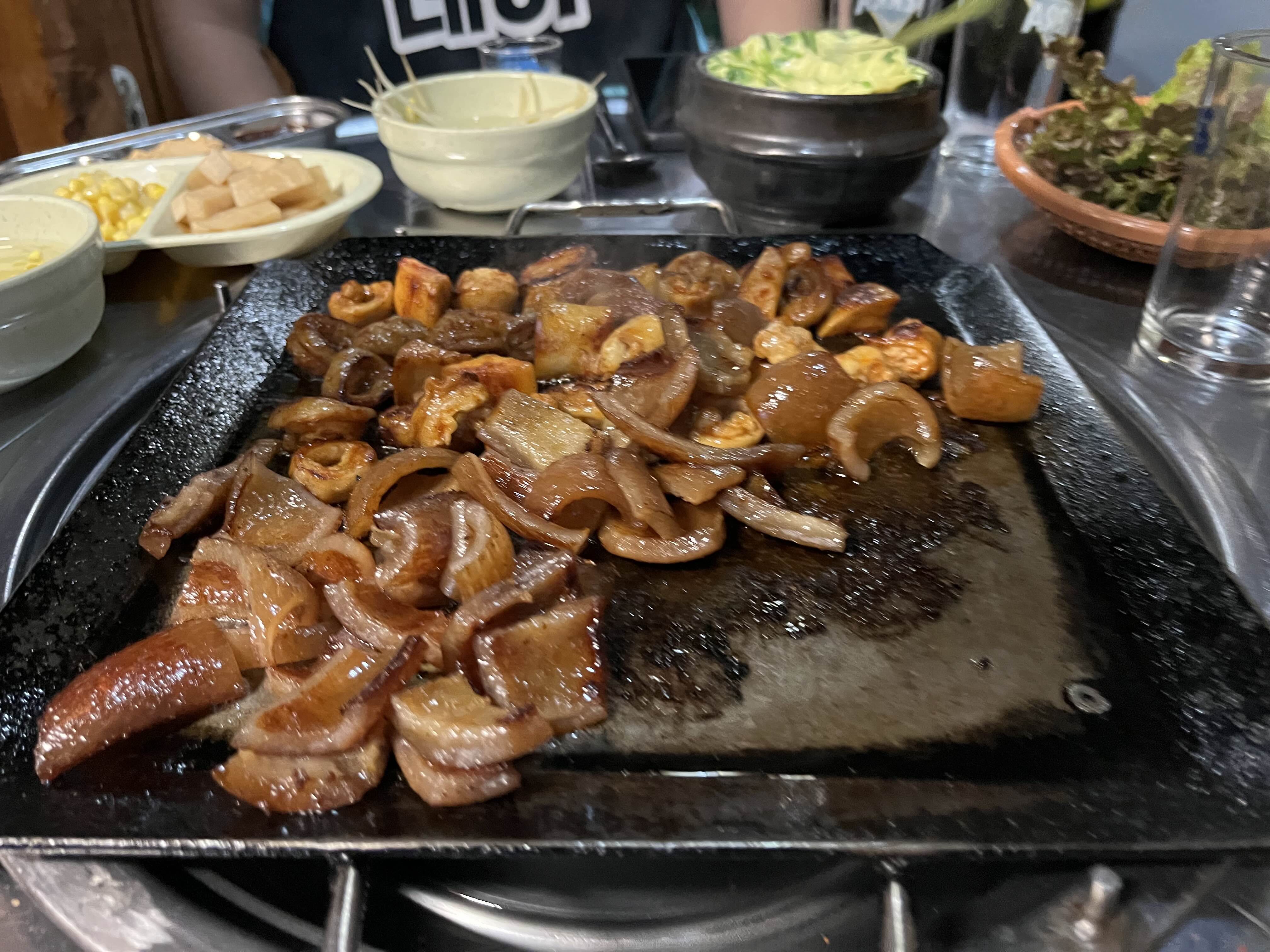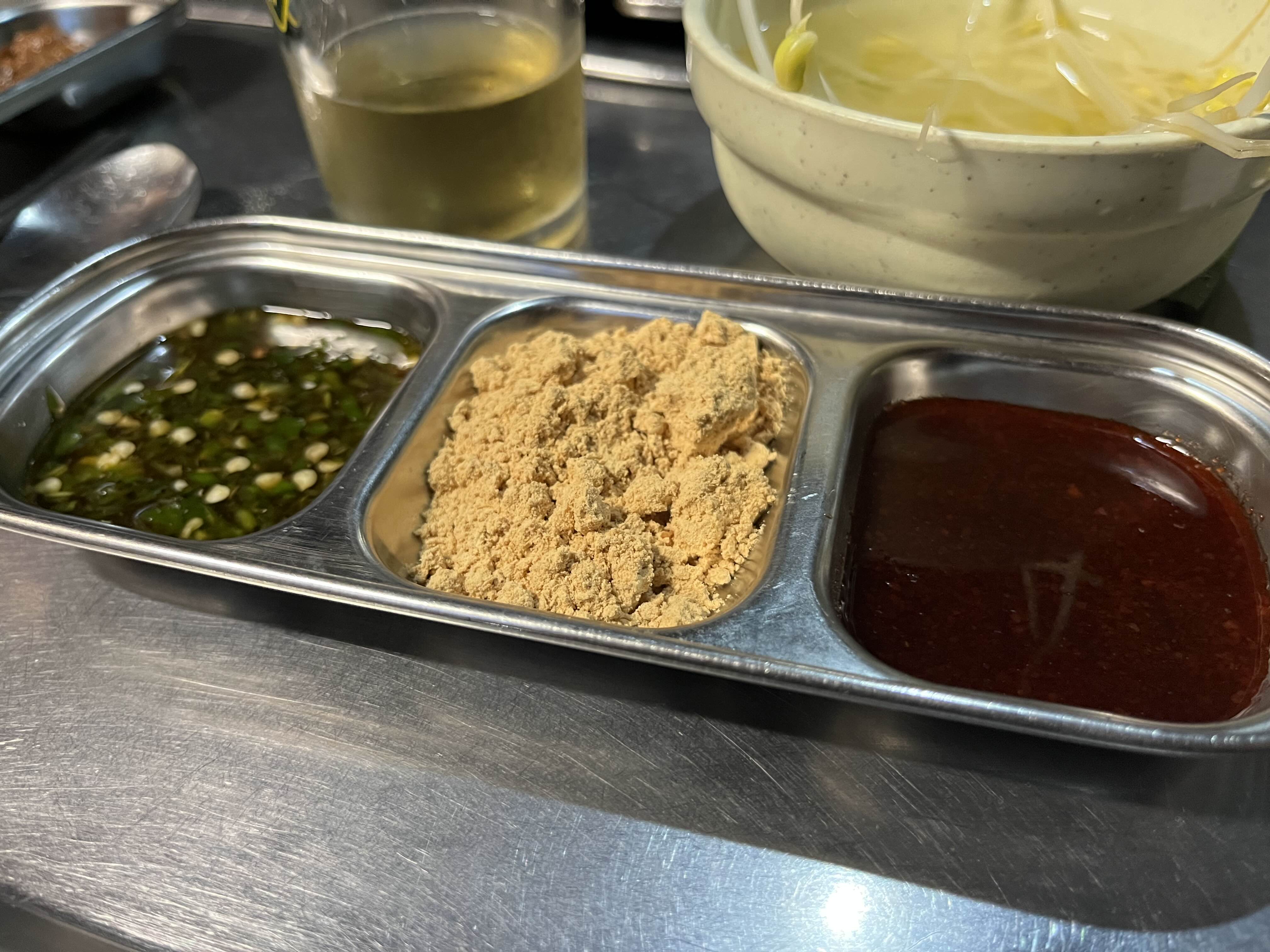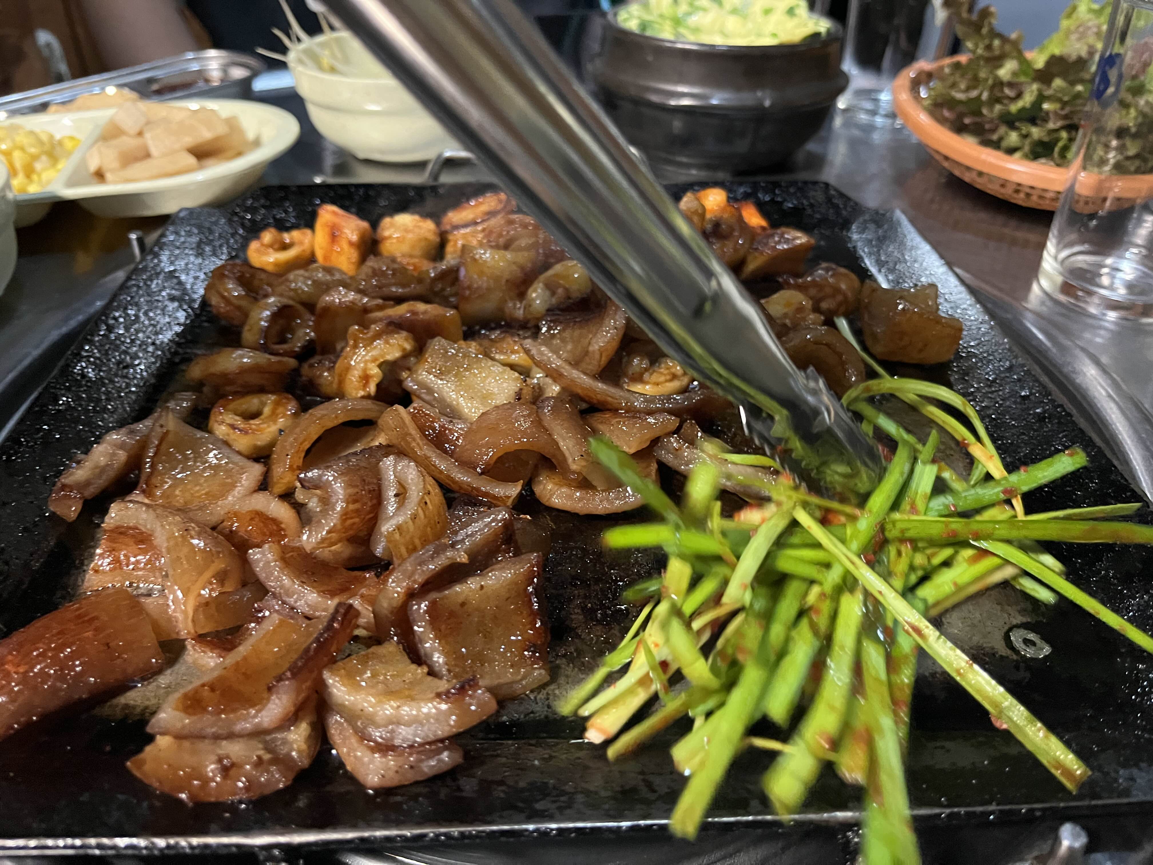 이렇게 한상차림 주시고, 저기 아래 부추보이는가!? 이것이 한상차림! 부추가 기가 막히다. 그리고 3종 소스들! 초벌되어 나오는 괴기들을 더 대워먹기만 하면되는 시스템!