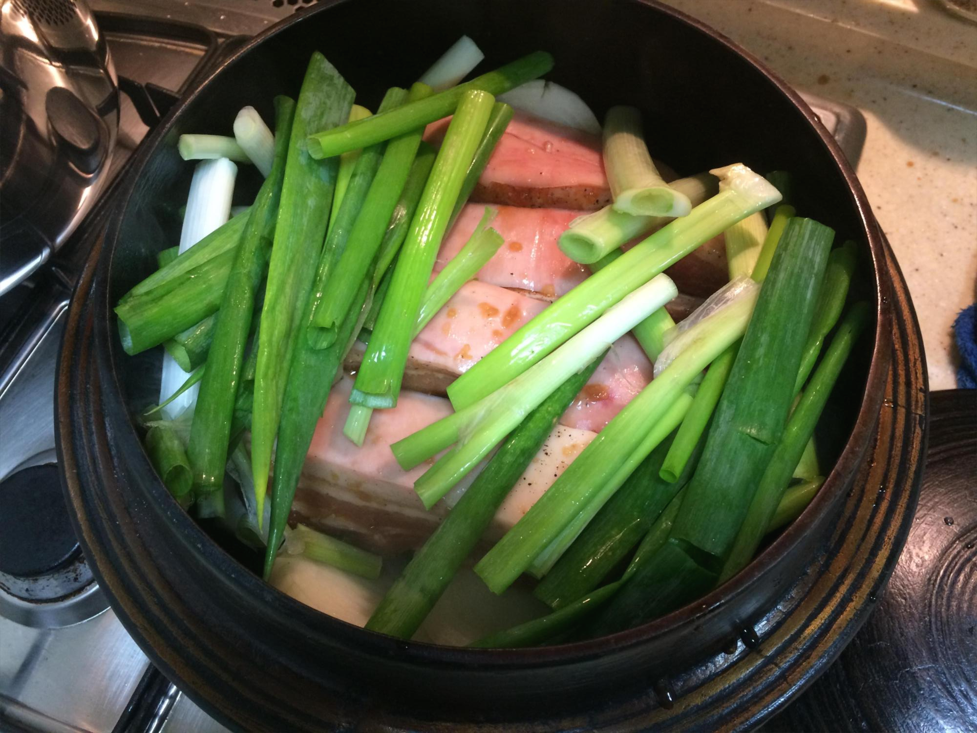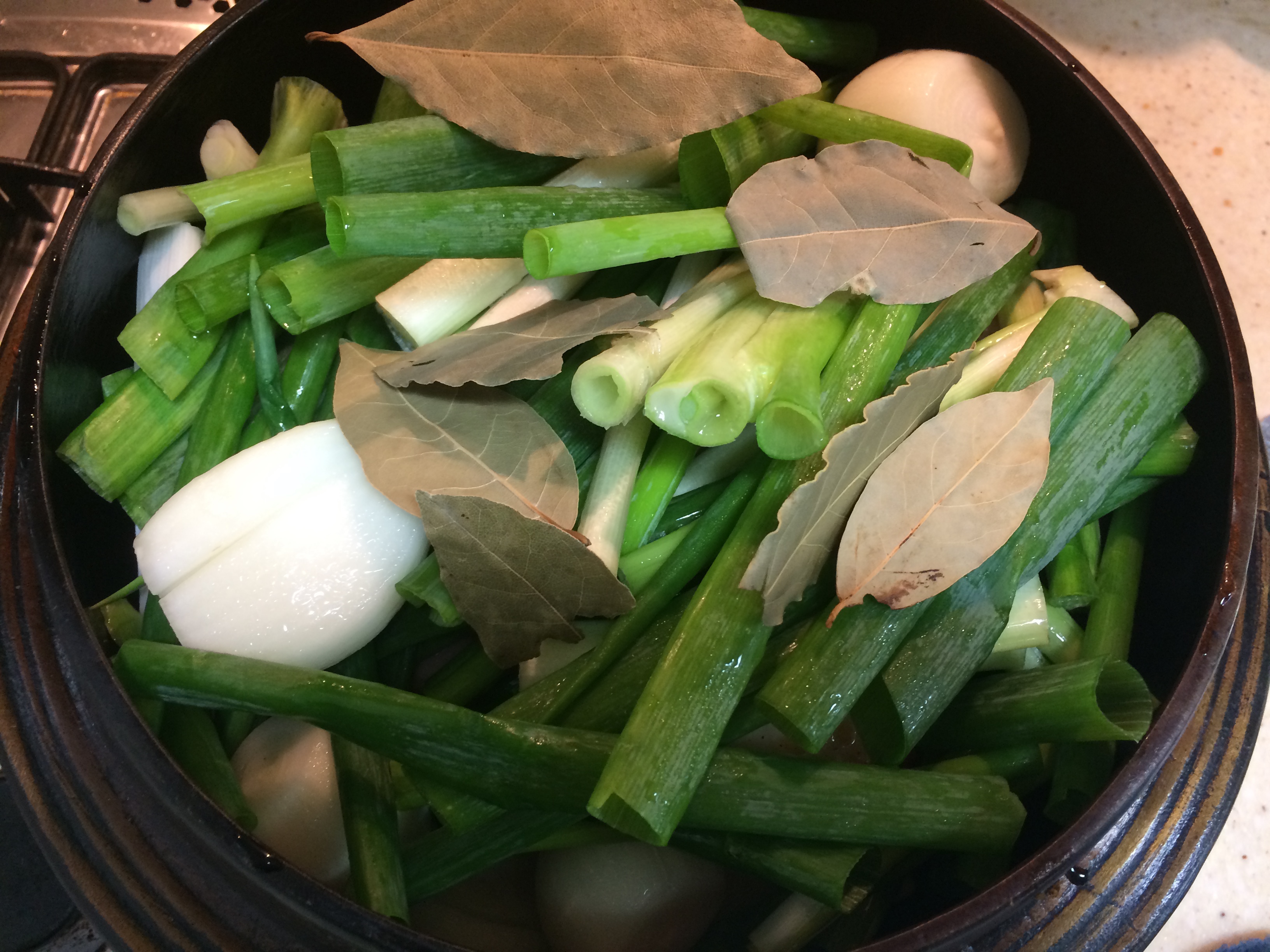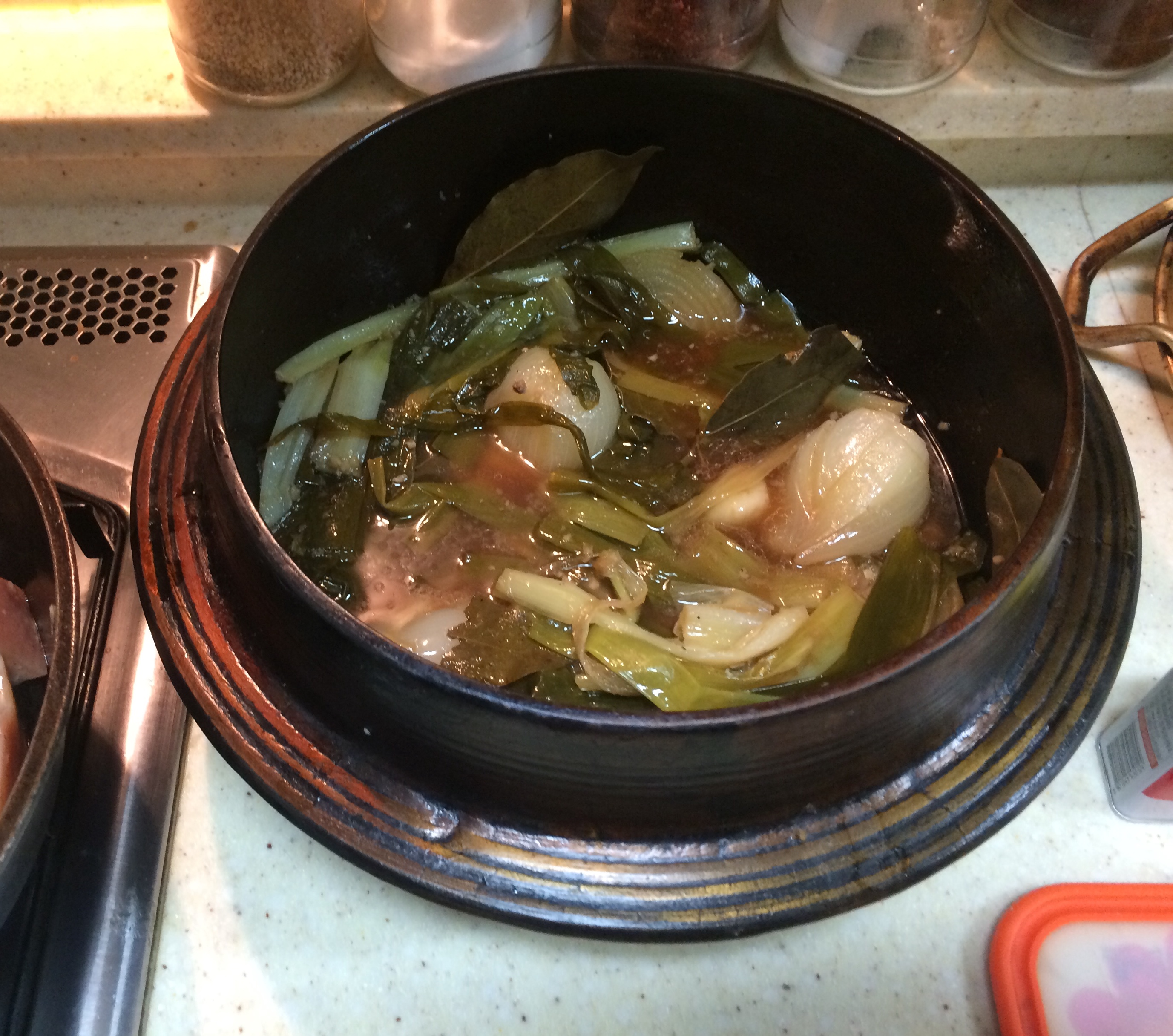 익힌 고기를 옮기고 남은 야채들.. 이때 국물이 조금 짜야되는데.. 좀 밍밍했다.. ㅠ 염지후에 양념하는걸 깜빡했다.. 끓이고 있을때 맛술이 더 추가 되어야 함..