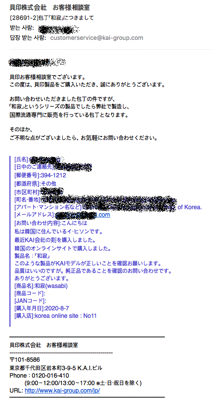 카이지 루시 고객 상담실입니다. 이번 카이지 루시 제품을 구입 해주셔서 감사합니다. 문의 주신 칼의 건입니다 만, "和寂" 라는 시리즈 제품 계시다면?? 당사에서 제조하고 국제 유통 전문 판매하고있는 칼입니다. 그 외 문의 사항이 있으시면, 부담없이 문의 해주십시오. - 구글번역 짱