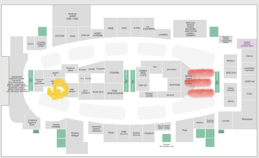 현대백화점 3층 지도 두바퀴 돌고 겨우찾은 모드맨 ㅋ 붉은색이 내가 지도를 본 지점 노랑점이 모드맨 위치