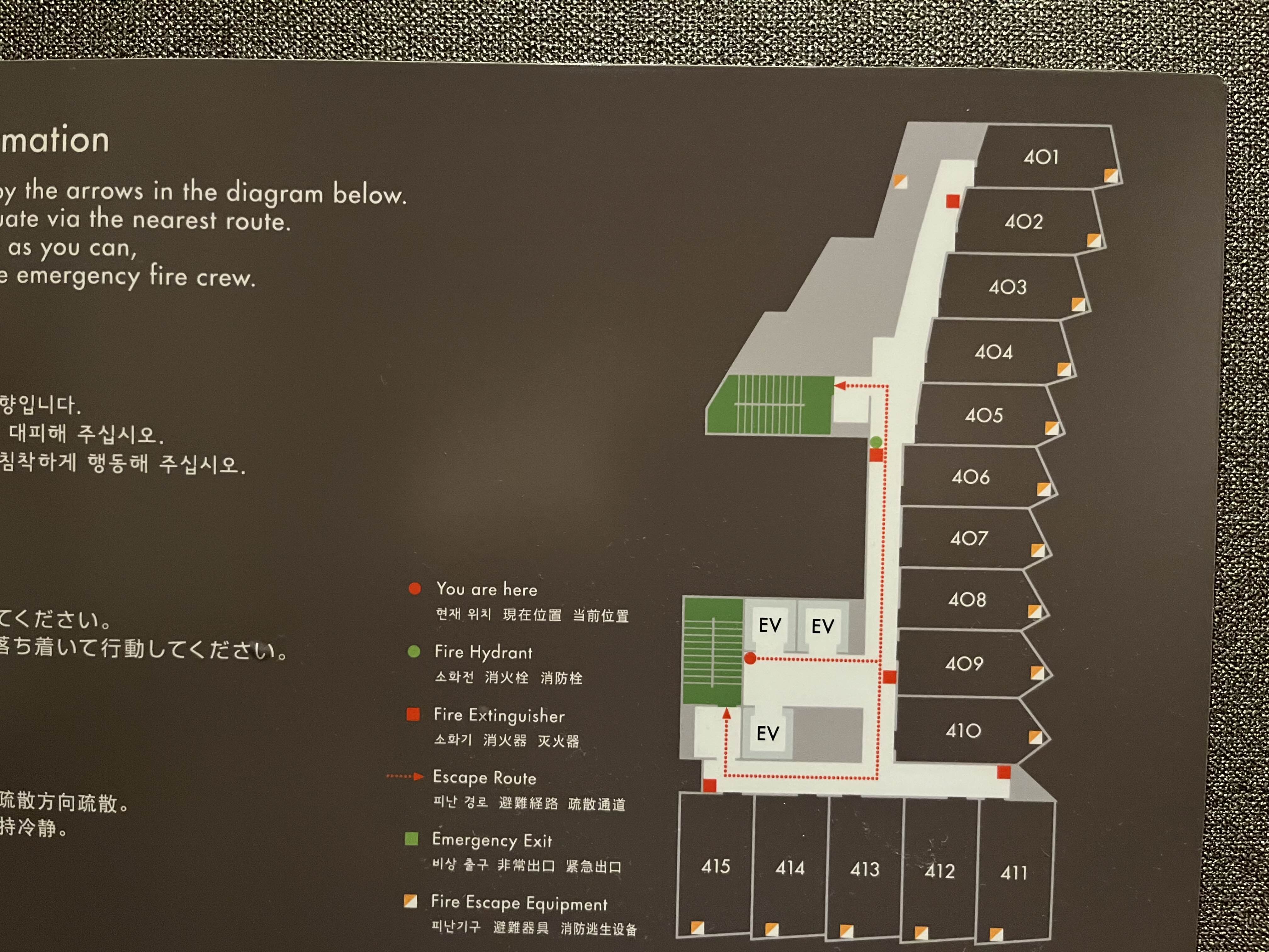 혹시모를일에 대비해서 비상구는 확인해놓자. 건물구조가 일자형이고 대부분의 사이즈가 비슷한구조고, 11-15호실이 대로변 시티뷰 일듯(입구)