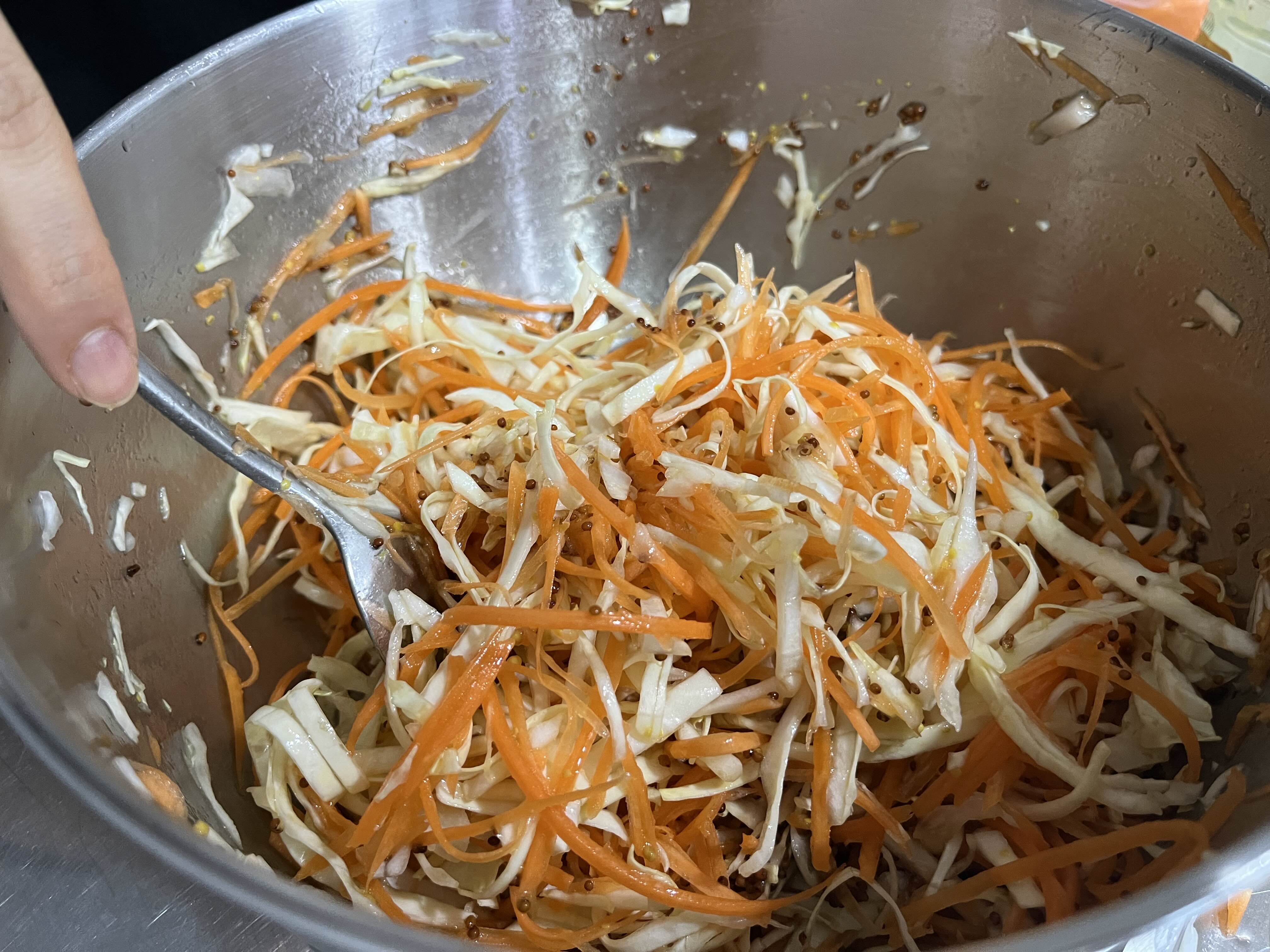 채 썬 당근에 드레싱을 붓고 골고루 섞어줍니다.