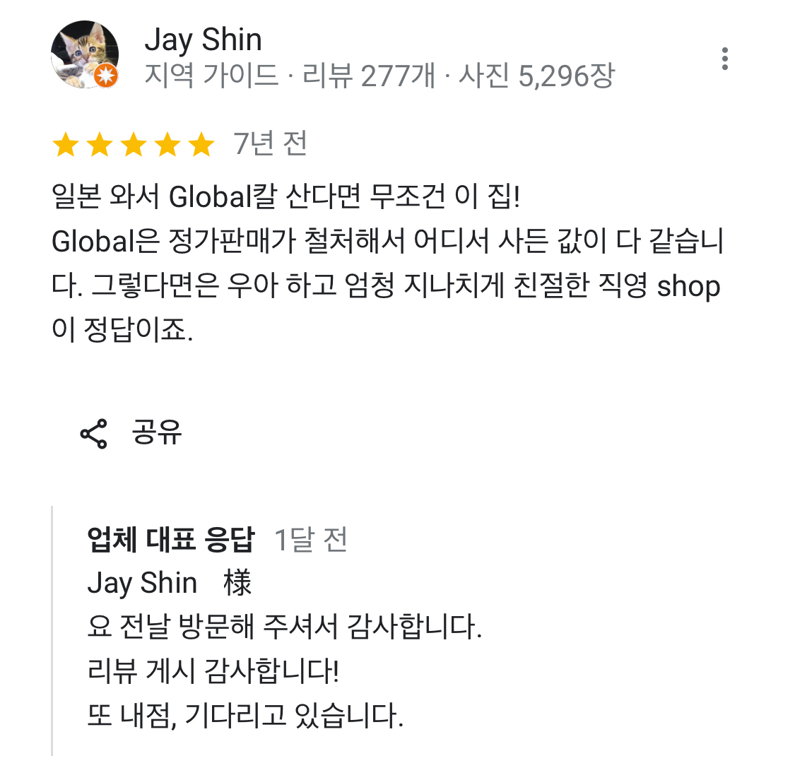 매장 입구 매장은 AXIS 빌딩 2층에 위치하고 있으며, 세련된 디자인과 다양한 GLOBAL 칼 제품이 전시되어 있습니다. 또한, 레이저 각인 서비스를 제공하여 개인 맞춤형 칼을 제작할 수 있습니다 . 매장에는 위에사 봤듯이 모델이 모두 전시되어있다.. ㅎㄷㄷ